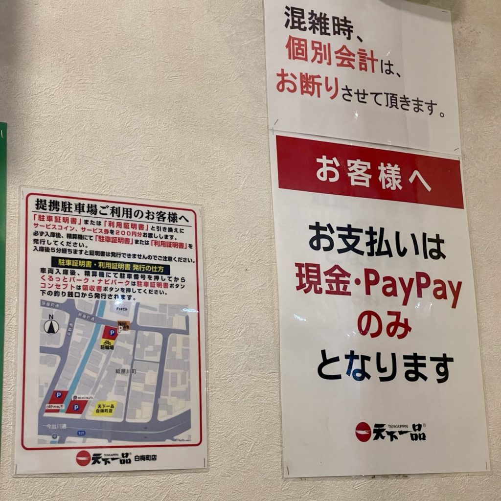 天一は他の大手チェーンと比較して、店によってキャッシュレス決済がないケースもありますが、白梅町店はPayPayが利用可とのこと。
