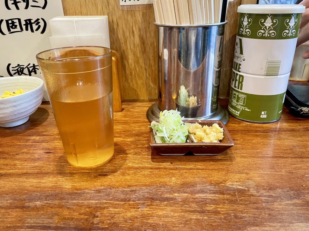 冷水機の隣にネギと生姜のセルフコーナー有り。