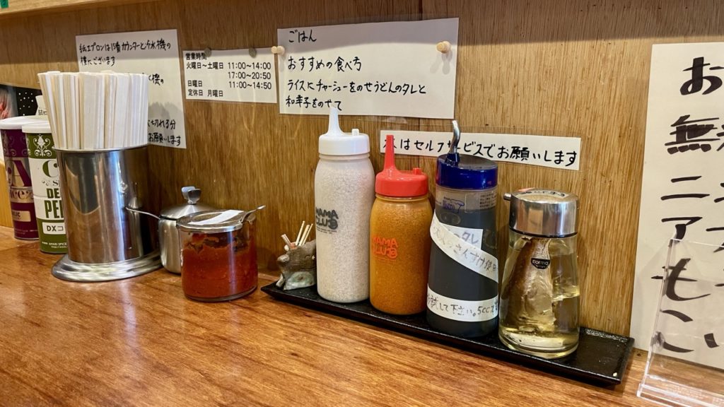 卓上調味料に力を入れてるようで、胡椒が2種類・おろしニンニク・豆板醤・すりごま・一味・うどんのタレ・煮干し酢・からしと、かなりの充実ぶり!他店でもここまで種類があるのはなかなか見ないですね。