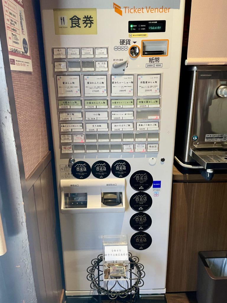 券売機の写真を撮っていると店員さんに声をかけられ「禁止だったか!?」と一瞬焦りましたが、店主さんが能登地震の支援活動をされているので、ぜひ募金箱もフレームインさせてお撮り下さいとのことでした^^;