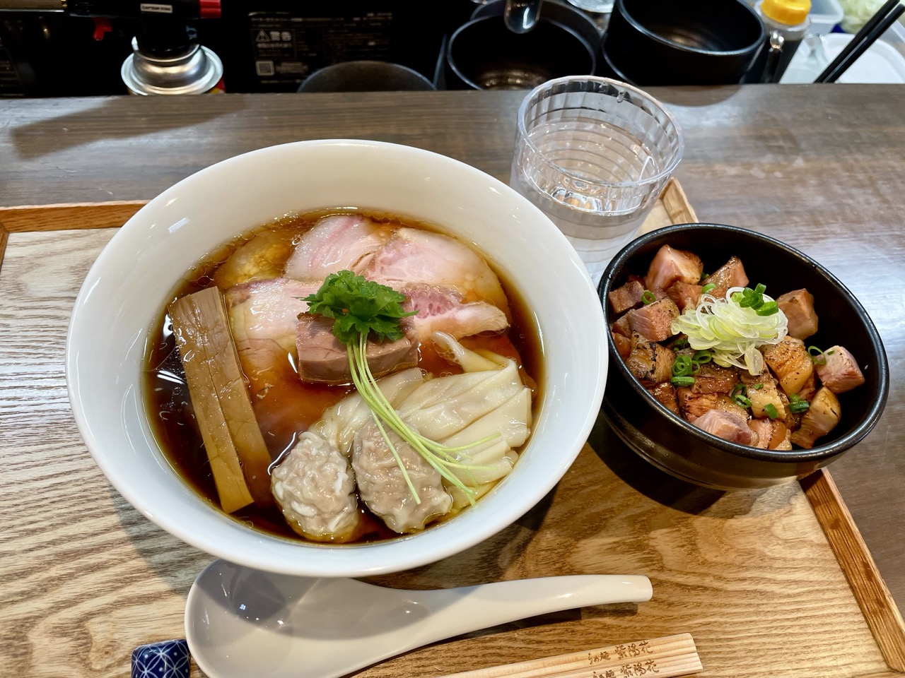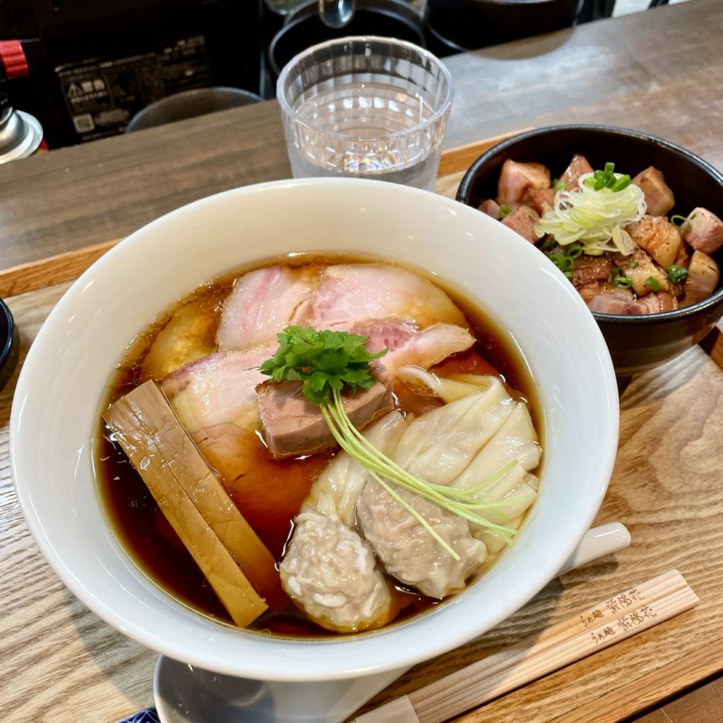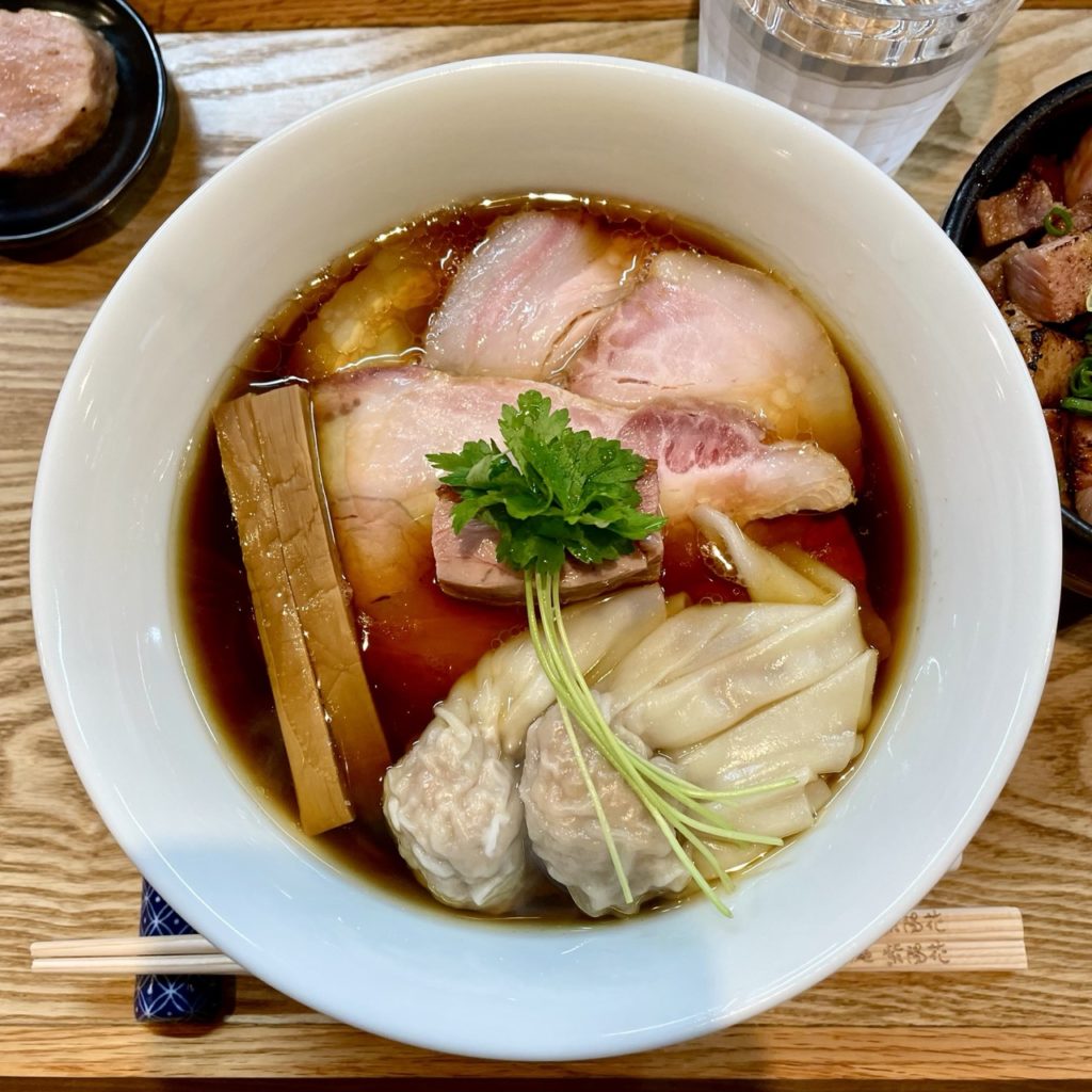具材はチャーシュー鶏ももわんたんメンマ三つ葉というラインナップ。