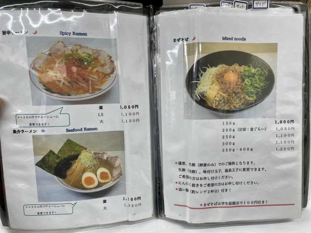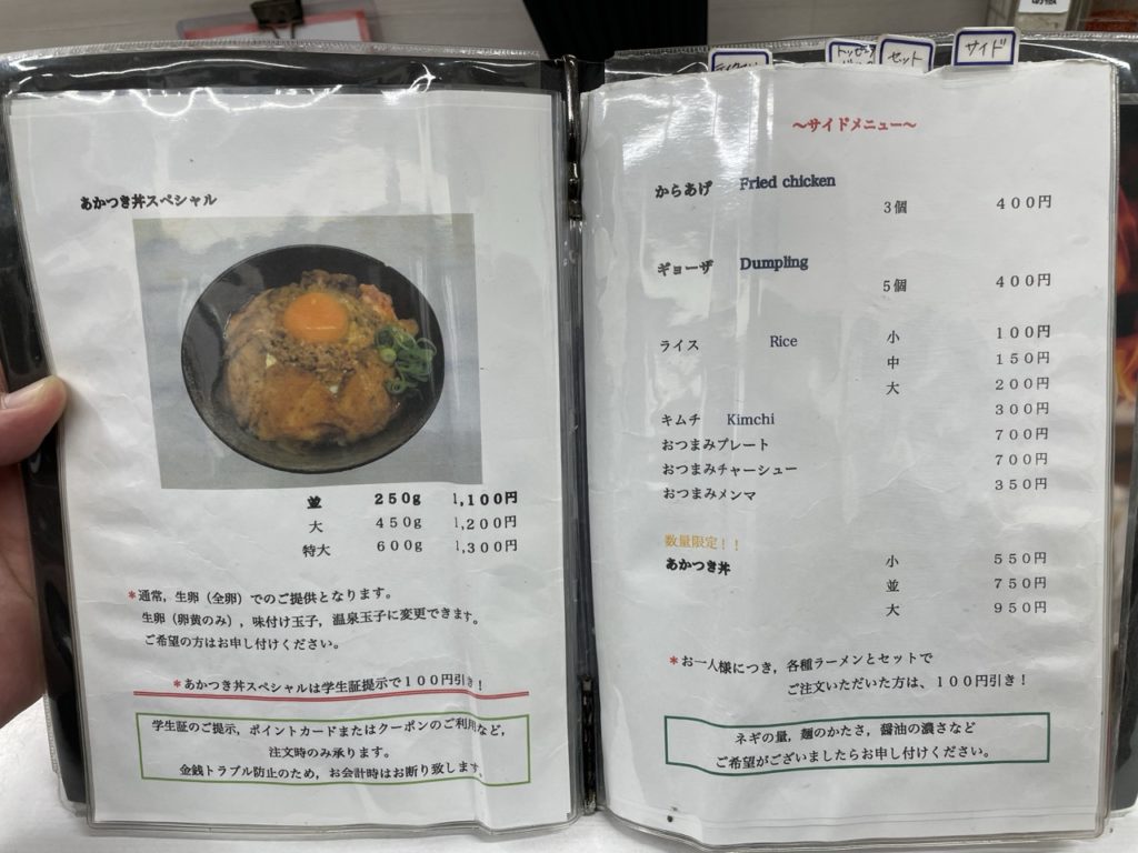 ラーメンのメニューだけでも5種類の味があり、注文時に学生証の提示で100円引きになるそうです。