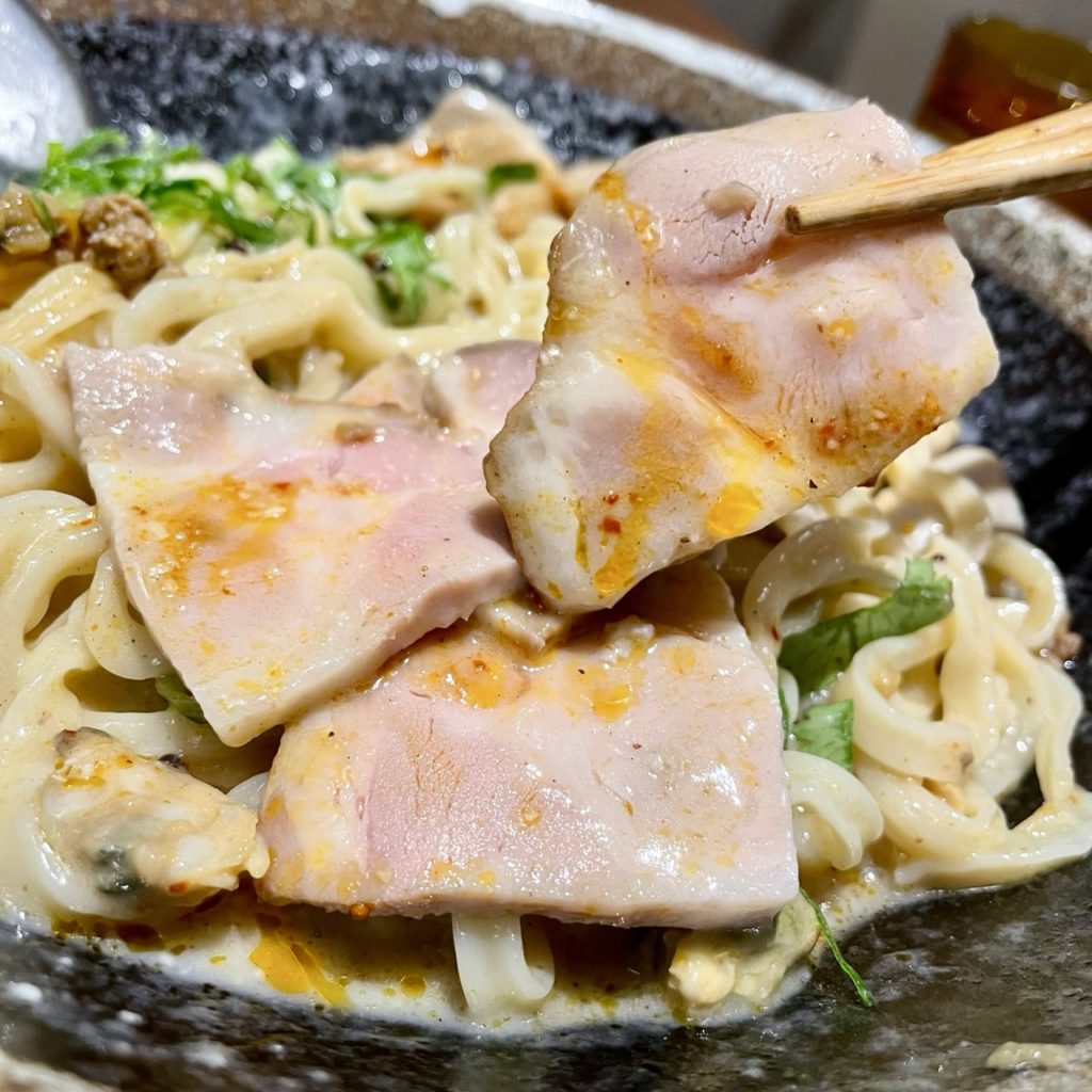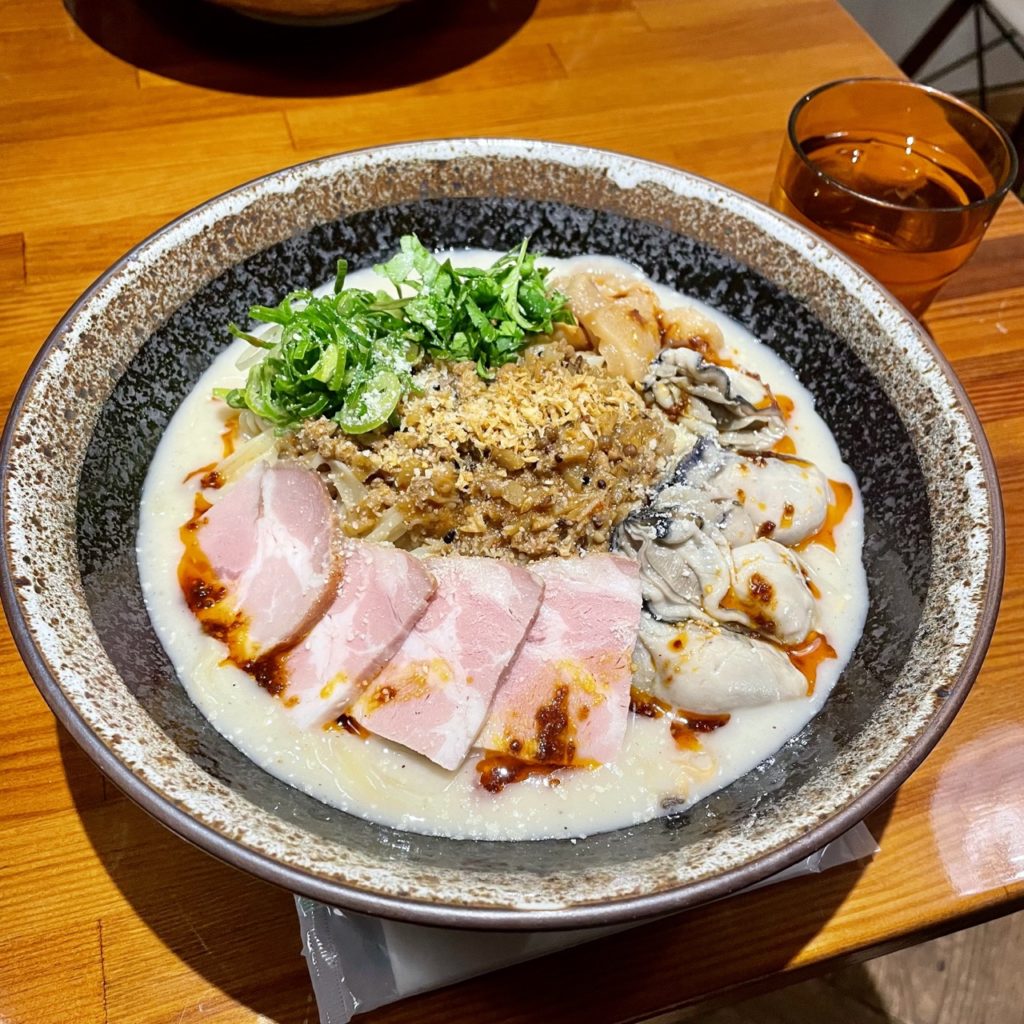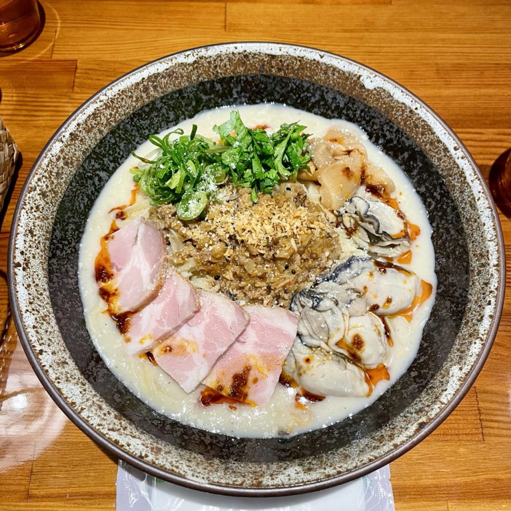 具材がとにかく豪華で、レアチャーシュー・牡蠣の酒蒸し・キーマ・メンマ・パクチー・ネギ・フライドオニオン・パルメザンチーズという盛り盛りよう!