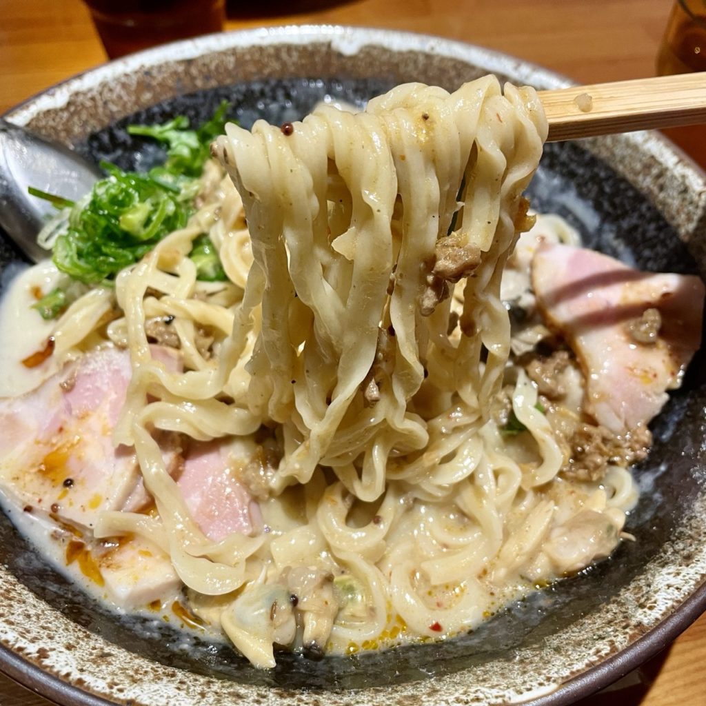 この麺の溝にはまったスープの粒子みたいなやつが美味いんだよな!