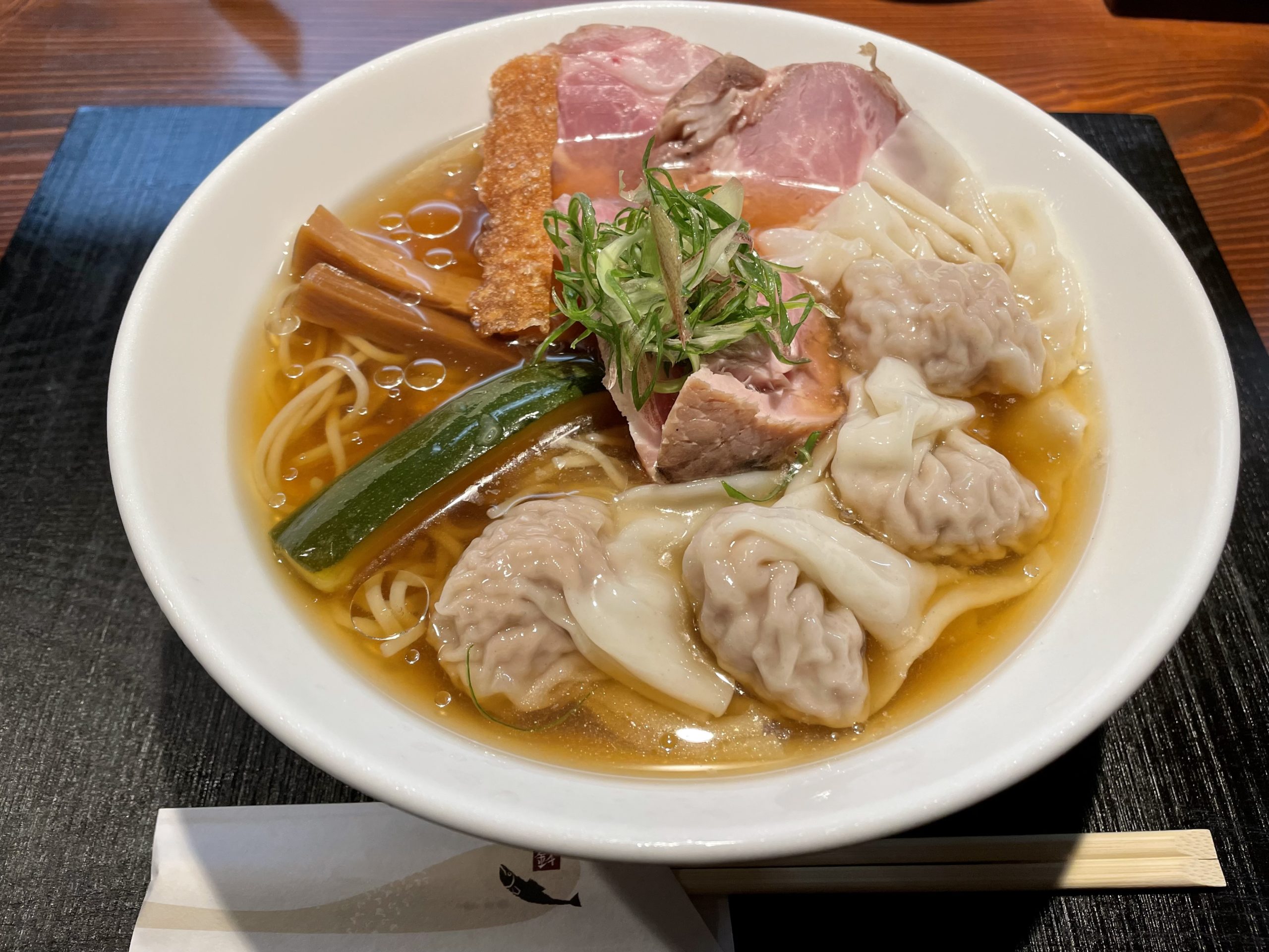 具材はショルダーハム、梨入りわんたん、ズッキーニお浸し、揚げわんたんの皮、メンマ、ネギ、みょうがとなっています。