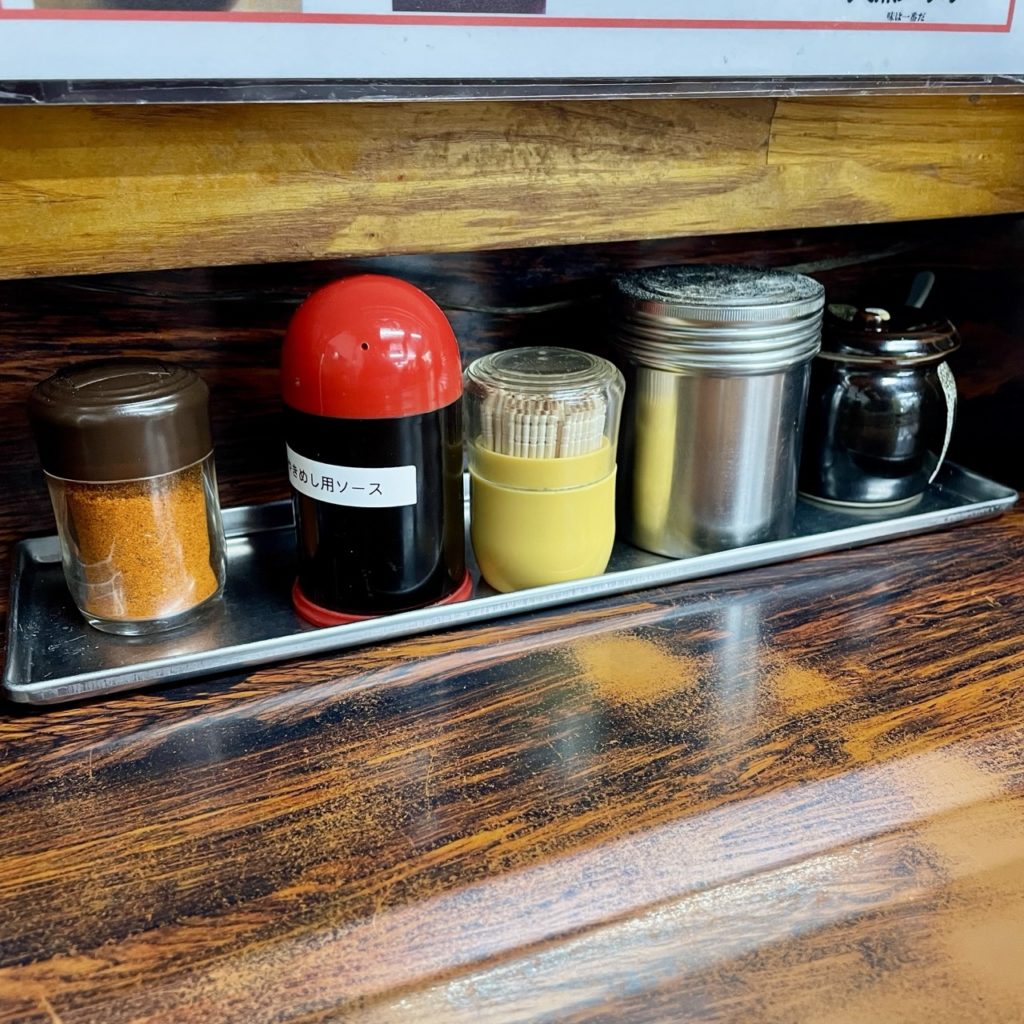 卓上には一味・やきめし用ソース・胡椒・辛いやつ。やっぱ京都ラーメンには辛いやつっすよ。