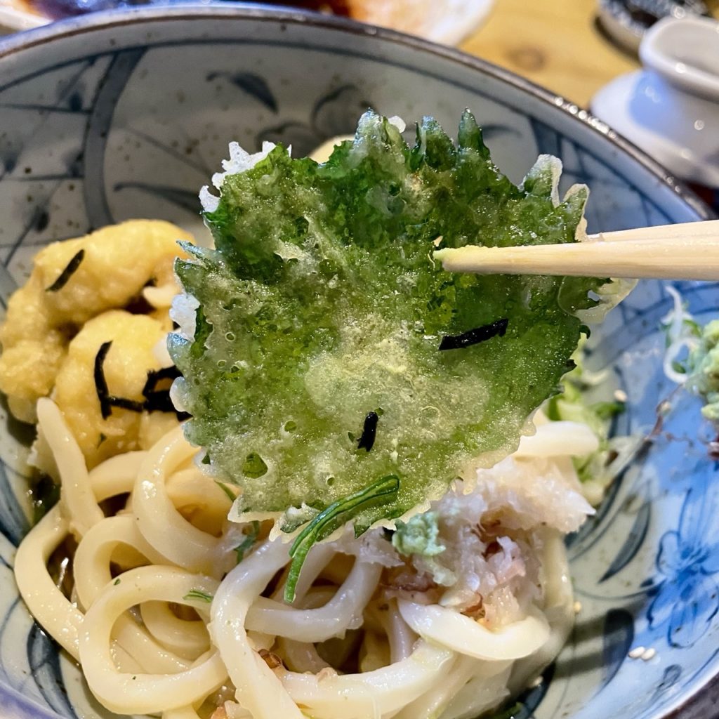 具材ははも天・大葉天・かまぼこ・ネギ・糸かつお・刻み海苔。