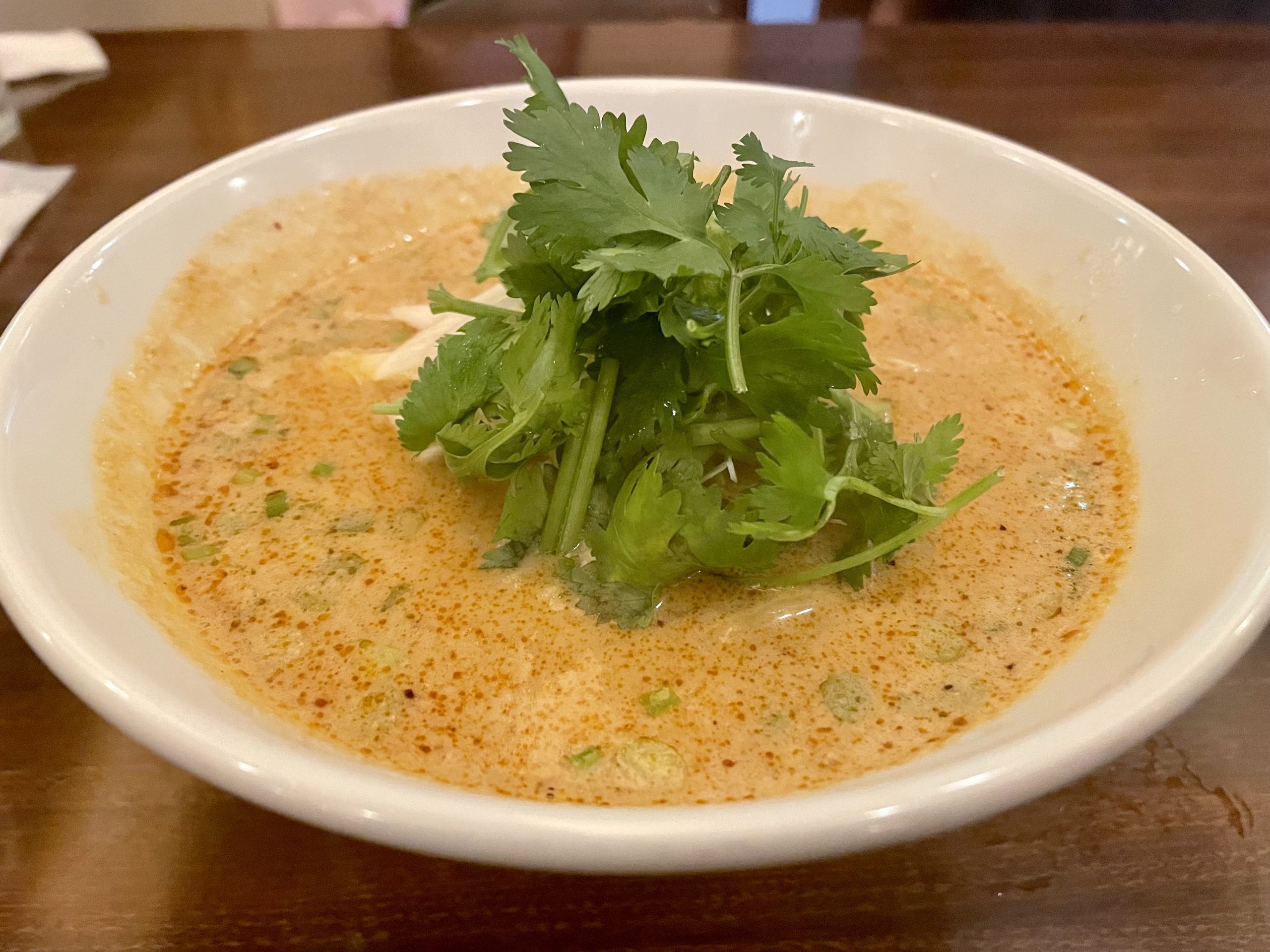 見た目は胡麻系の担々麺のようですが、パクチーがどっさり載っていてエスニックな香りがします。
