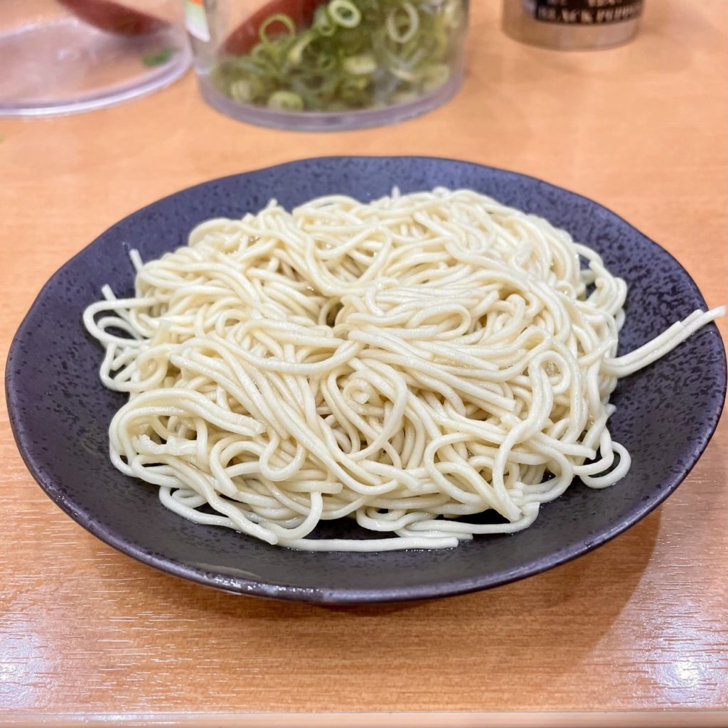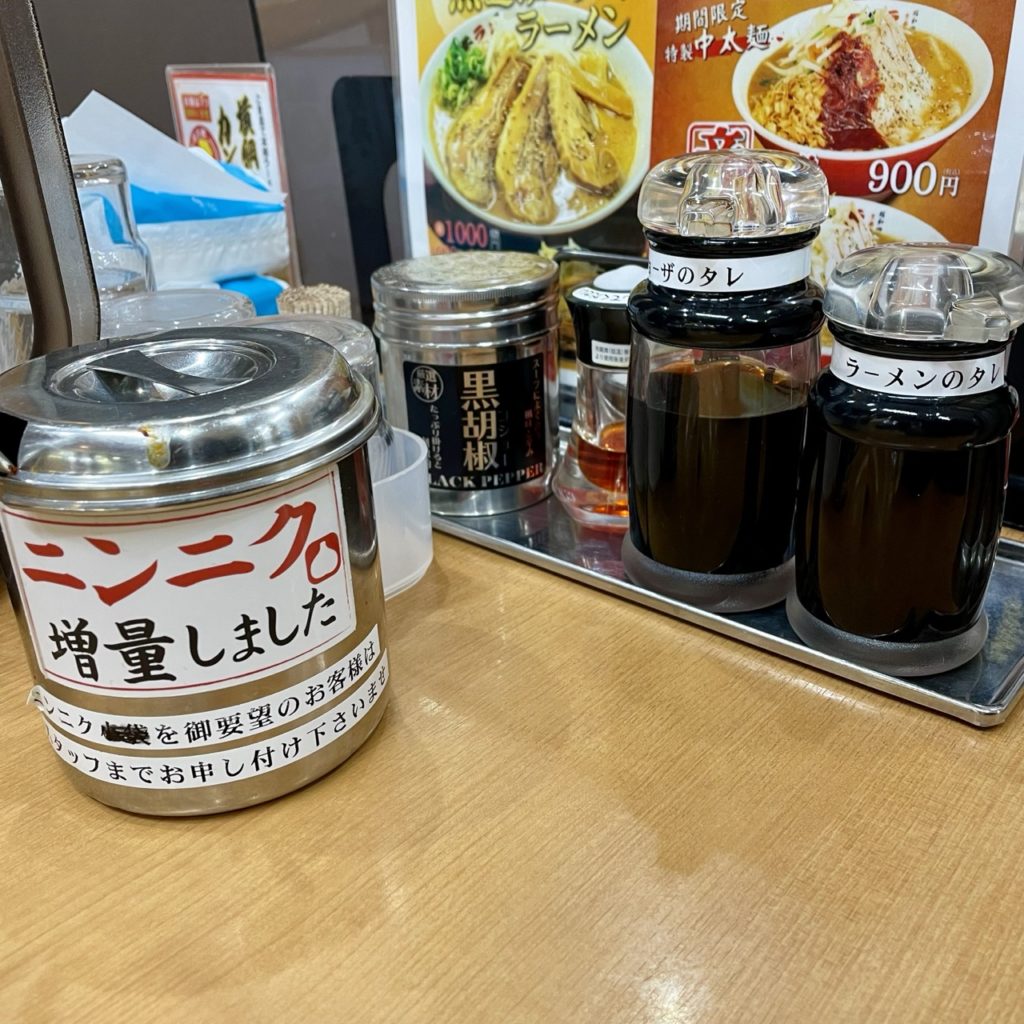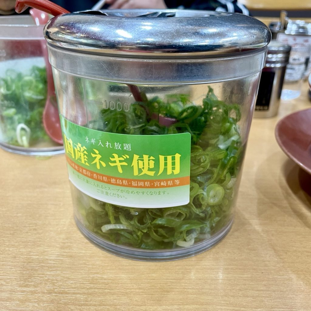 ラーメンを注文するとこのネギの入れ物が一つ提供されますが、今日は同行者もネギ大好き派だったので、お願いしてもう一ついただいています。