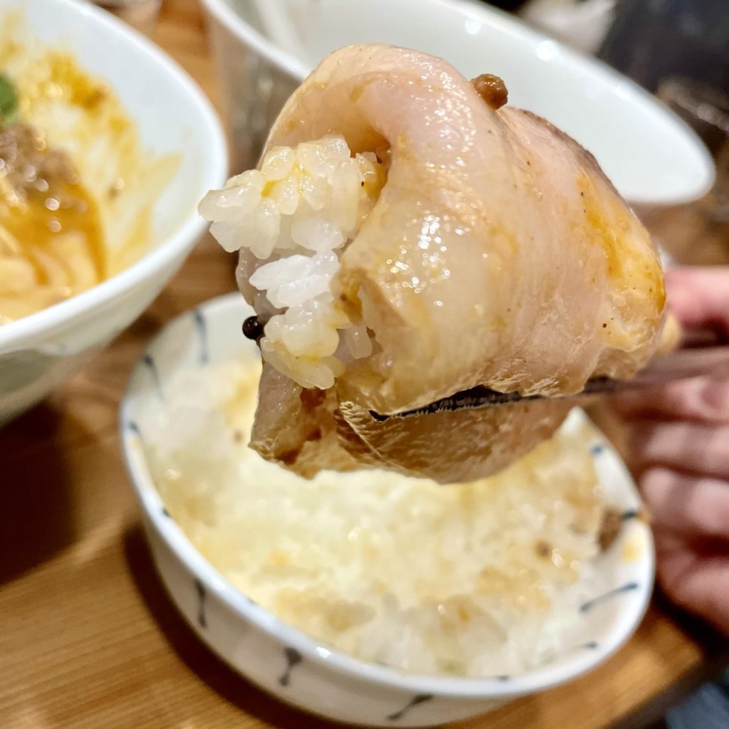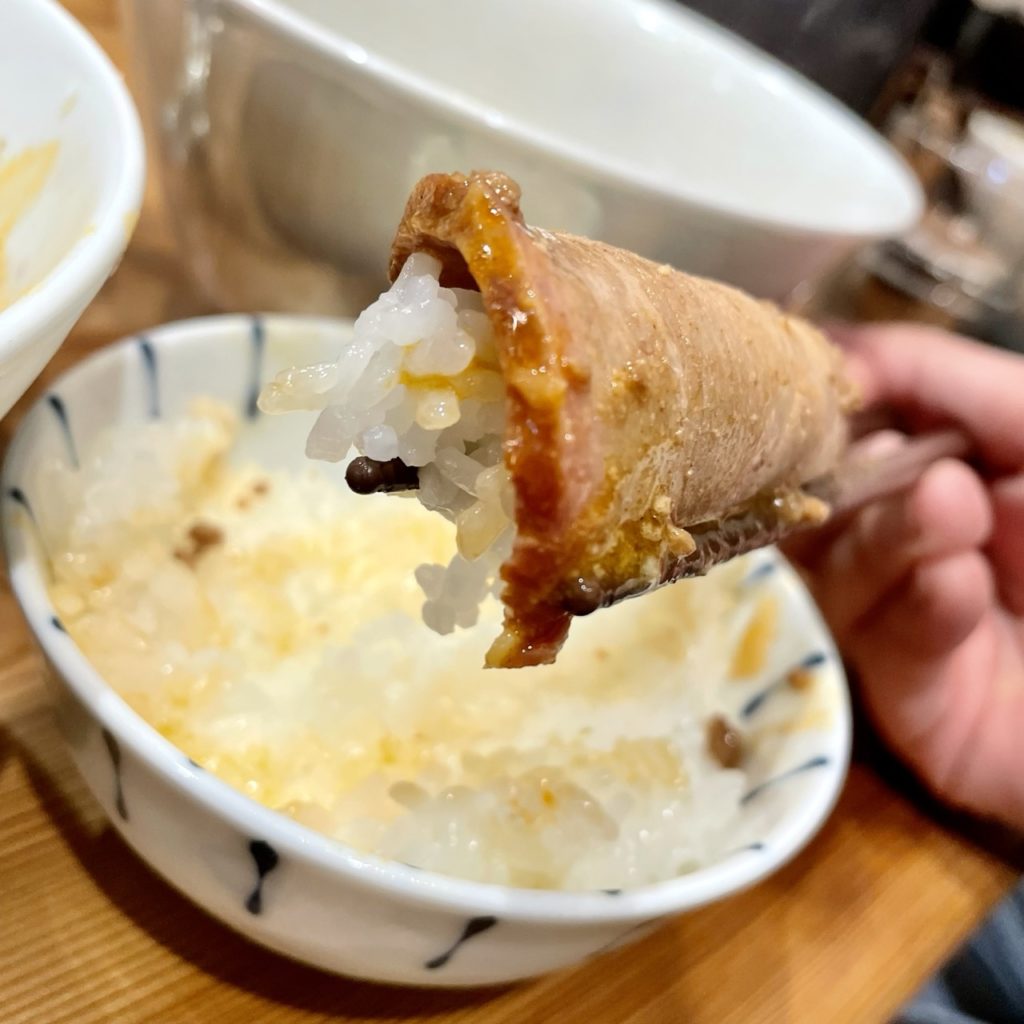 キメ細かい肉に甘みのある脂身、それらで包み込むつやつやの炊き立てごはん!