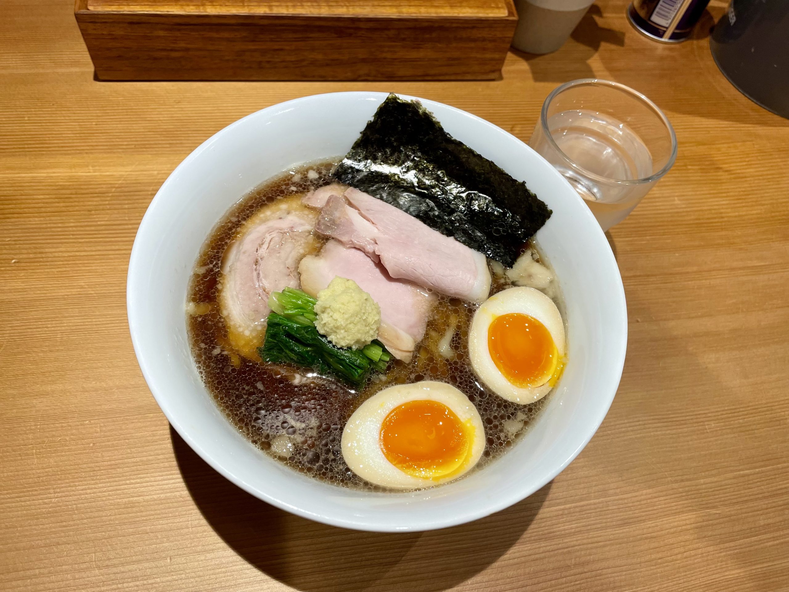 具材はチャーシュー・海苔・ほうれん草、そして増した味玉と、おろし生姜がもりっと盛られています。
