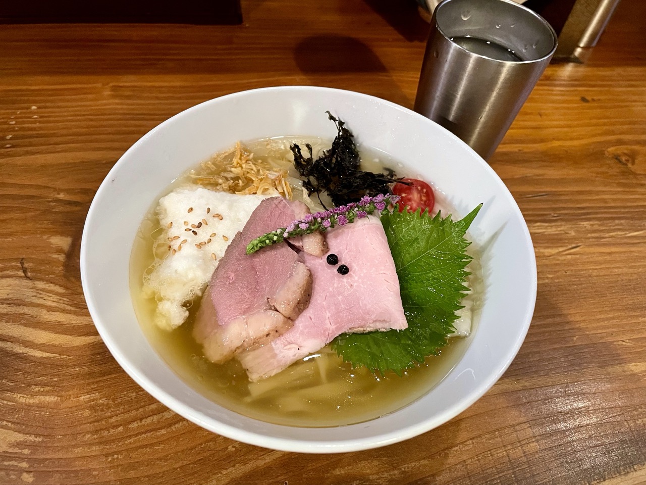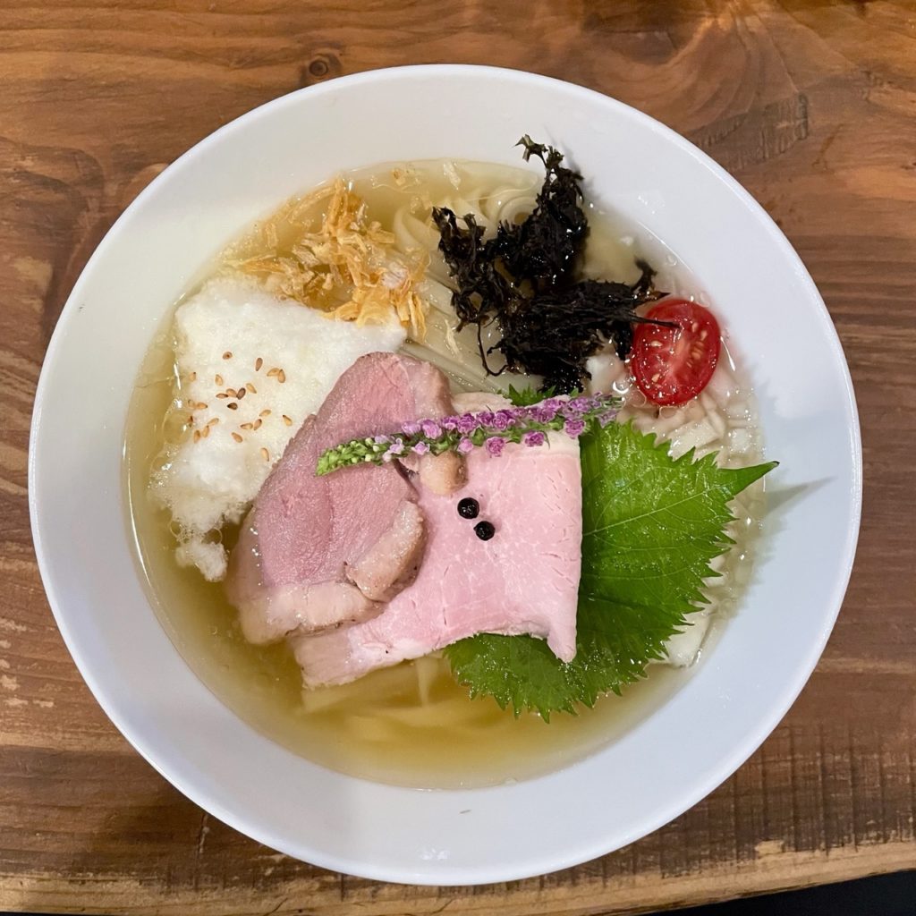具材は鴨チャーシュー・豚チャーシュー・とろろ・玉ねぎ・ミニトマト・ばら海苔・大葉・フライドオニオン・粒胡椒という豪華な内容!