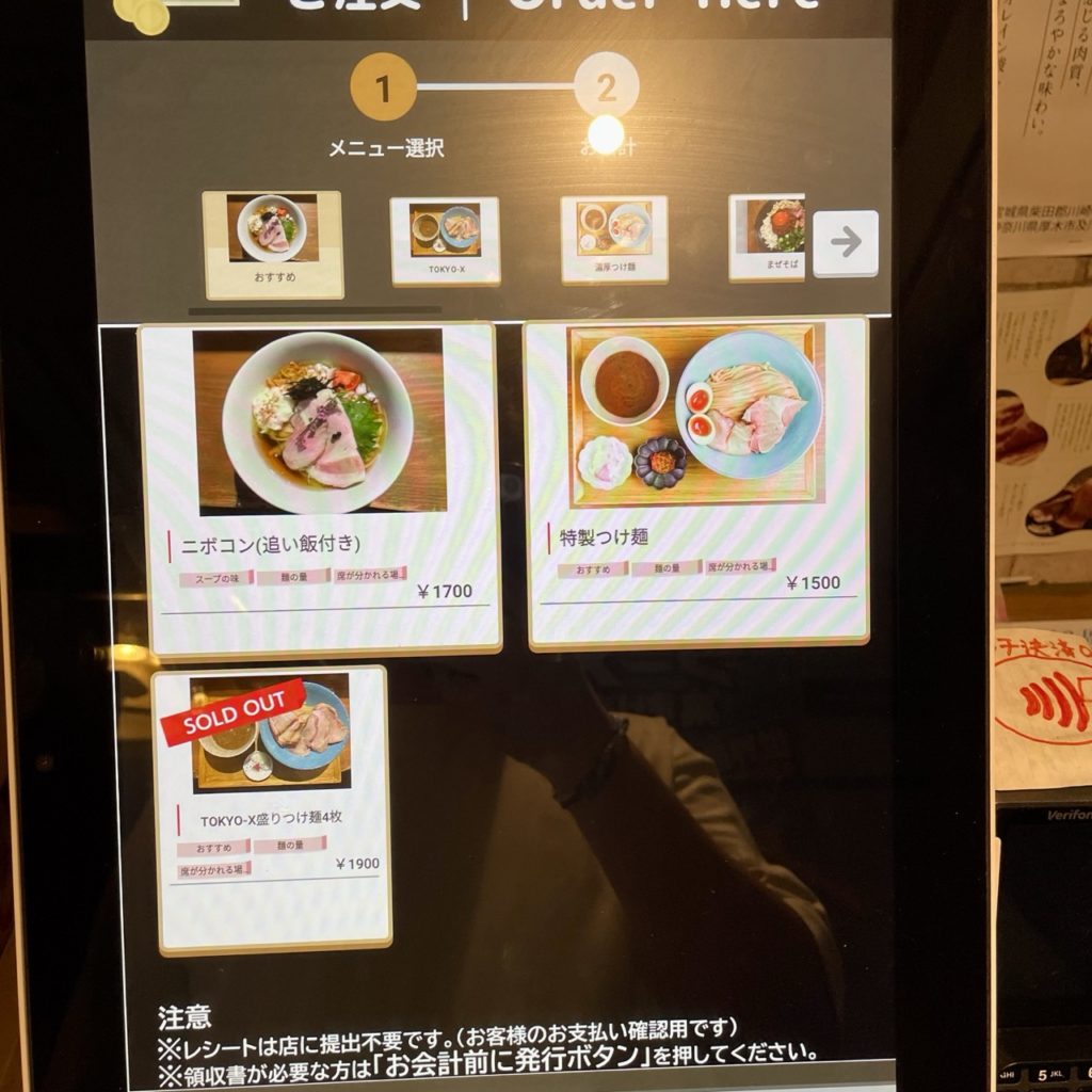 画面推移して味を塩と醤油、麺量を150gと200g、そして何人で来店しているかを選択して発券します。
