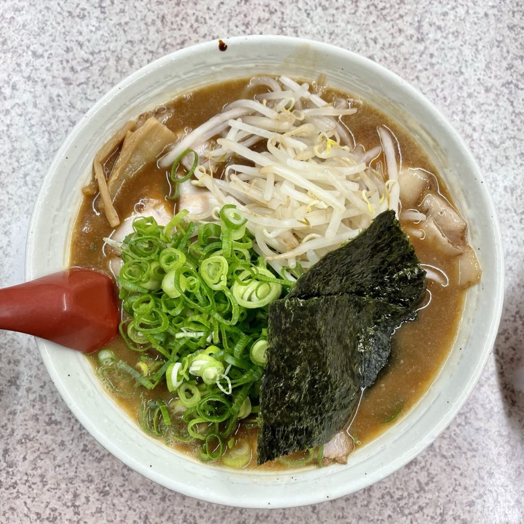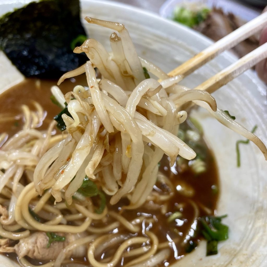 具材はチャーシュー・メンマ・もやし・ネギ・海苔。ネギともやしは無料で増量できるので、両方多めでお願いしています。