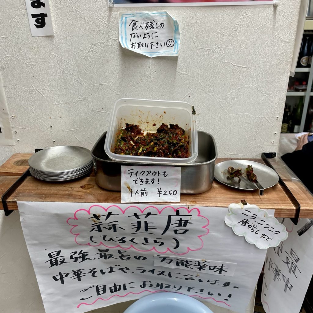セルフコーナーに蒜韮唐(ひるくさら)という万能薬味がありました。