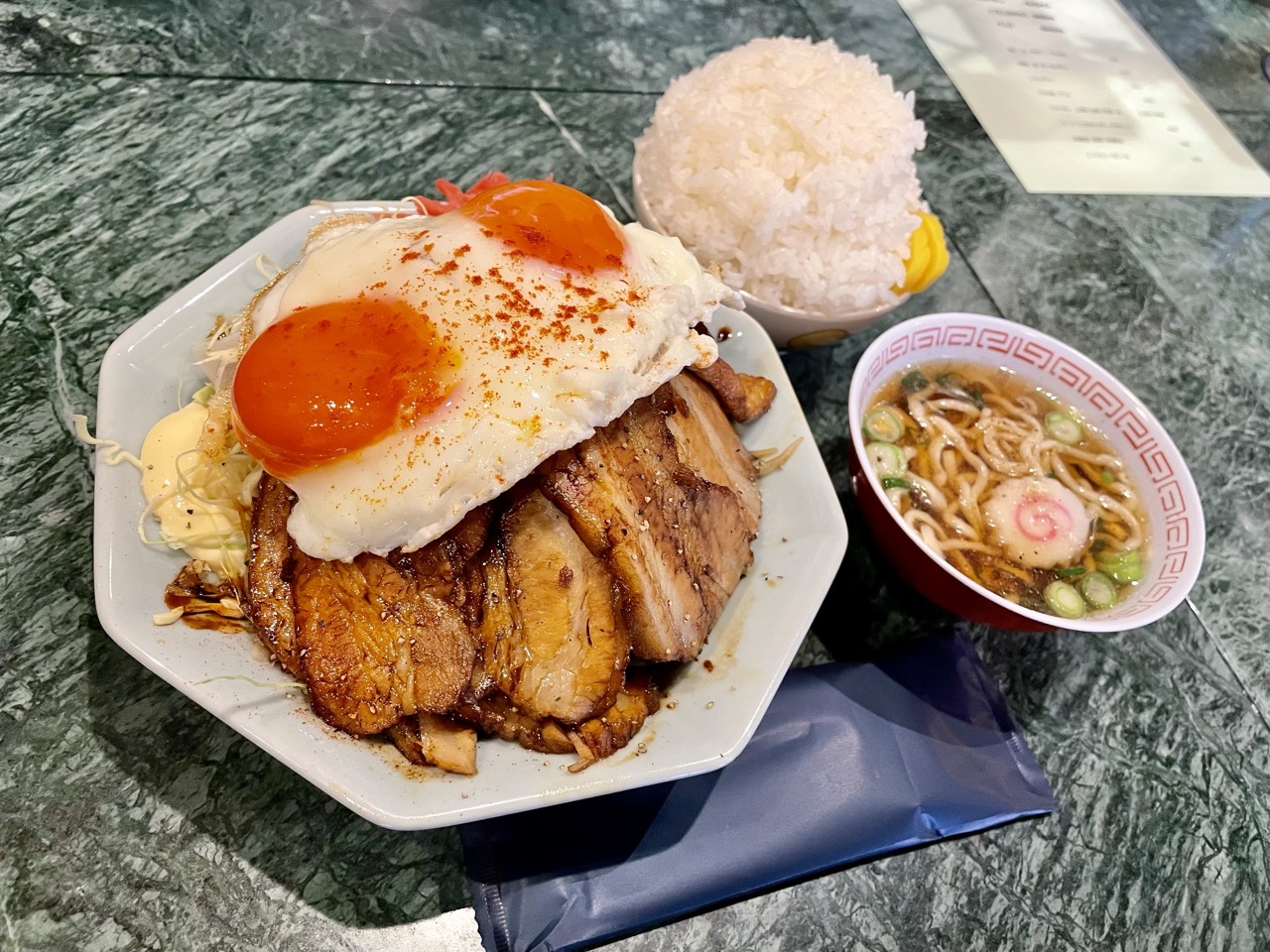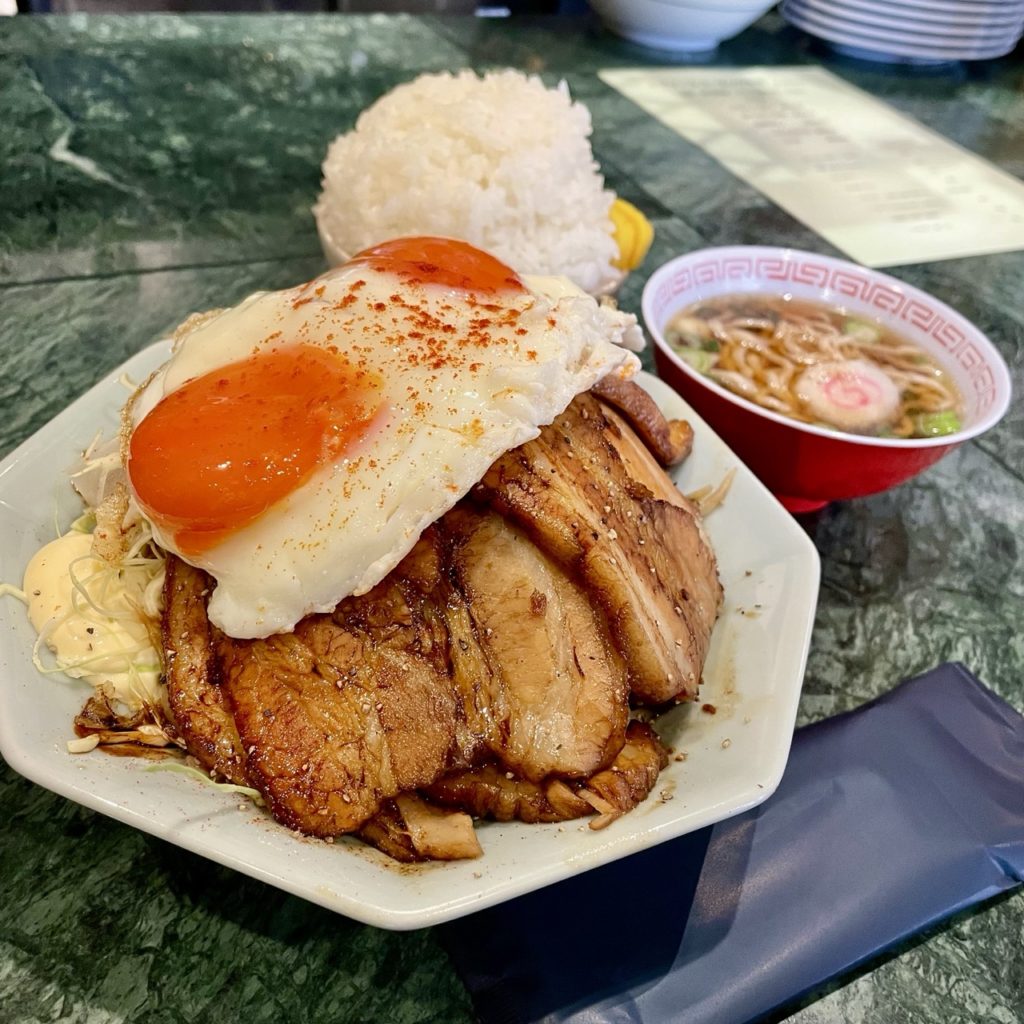 定食のセット内容は焼豚・目玉焼き・ミニ中華そば・ごはん!