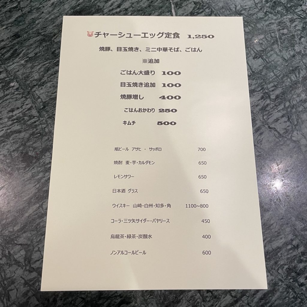 基本のセットが1,250円で、ご飯の大盛りや焼豚・目玉焼きをオプションで増量することができます。