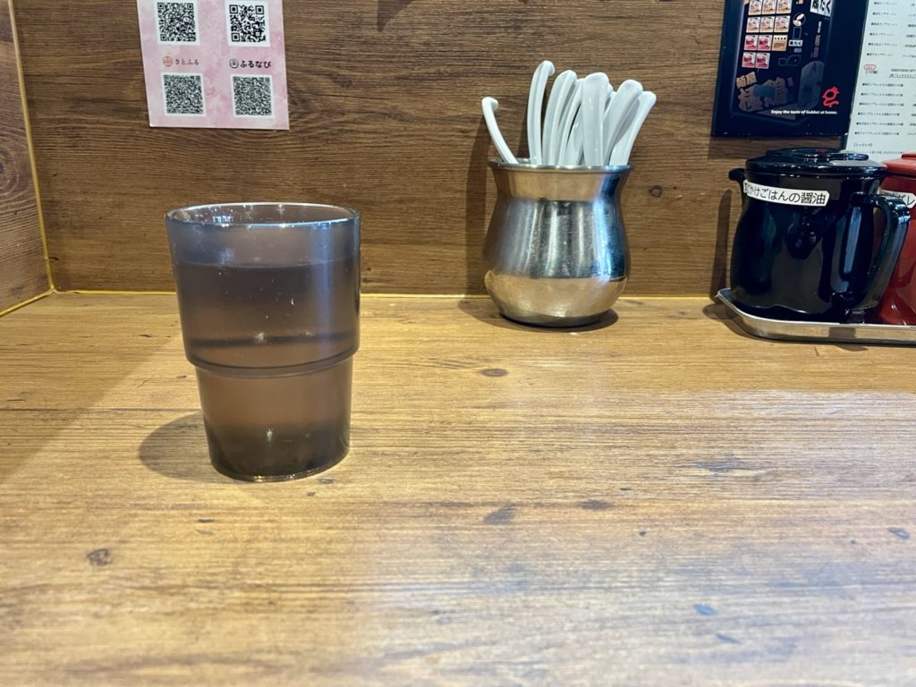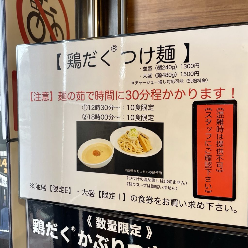 食券を渡すと、提供に30分以上かかること・つけ汁の温め直しができないこと・割りスープは無いことの説明があります。