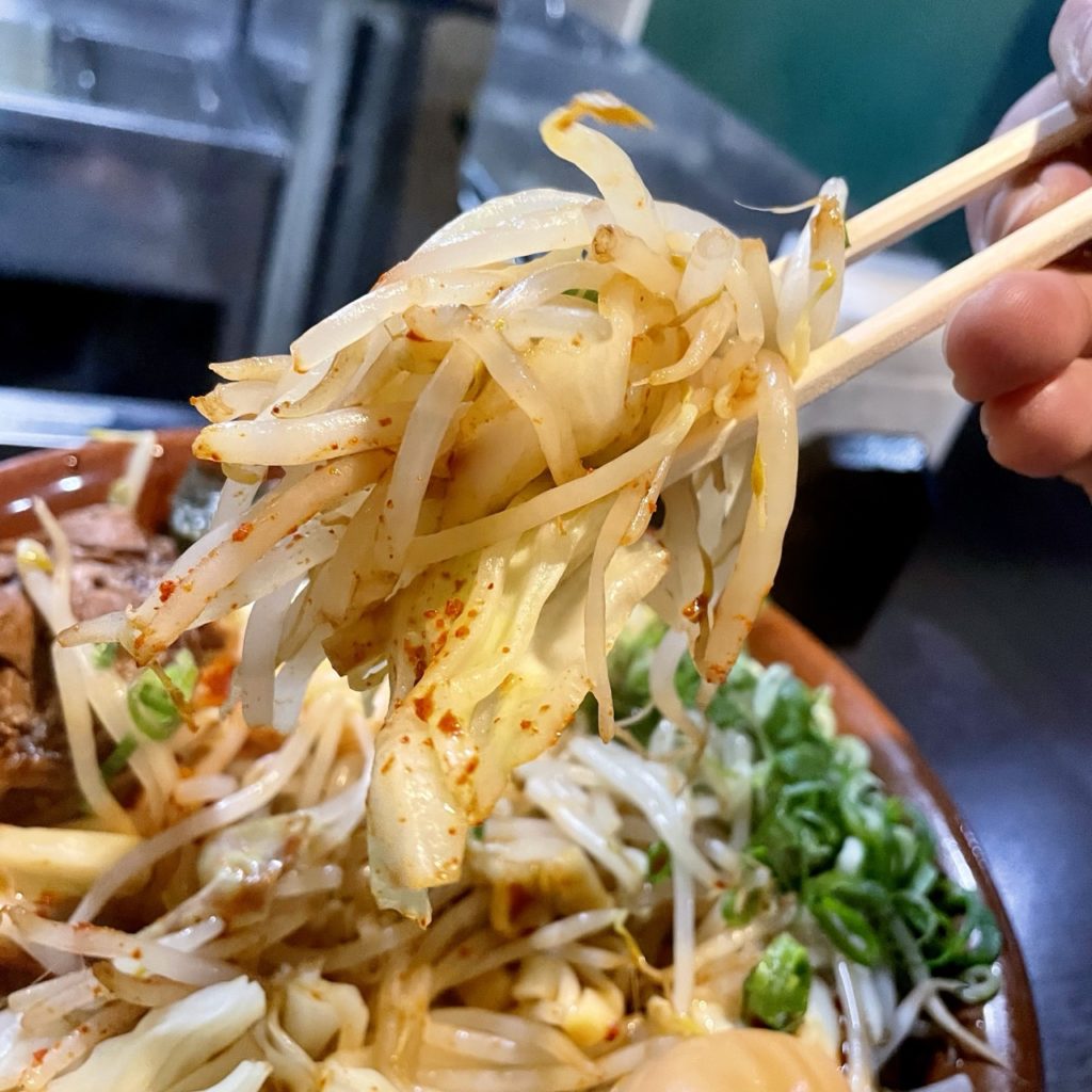 一番てっぺんのカエシがよくかかった部分の野菜うめぇ〜〜!キャベツに振りかけられた一味をこすりながらモシャモシャ食べるのが好き!