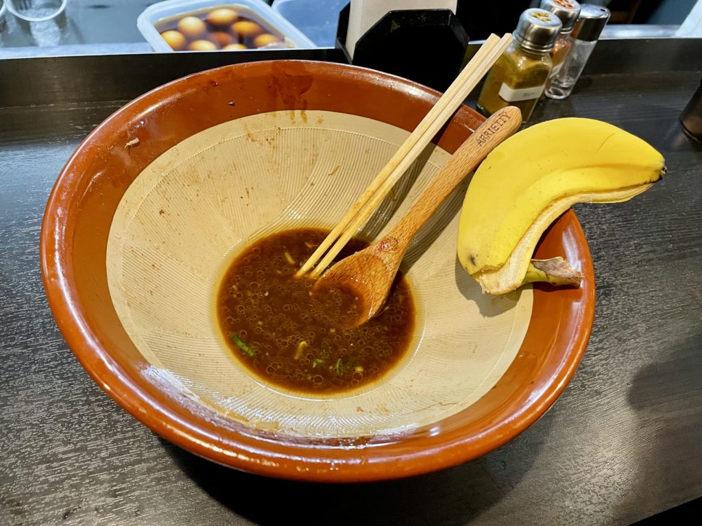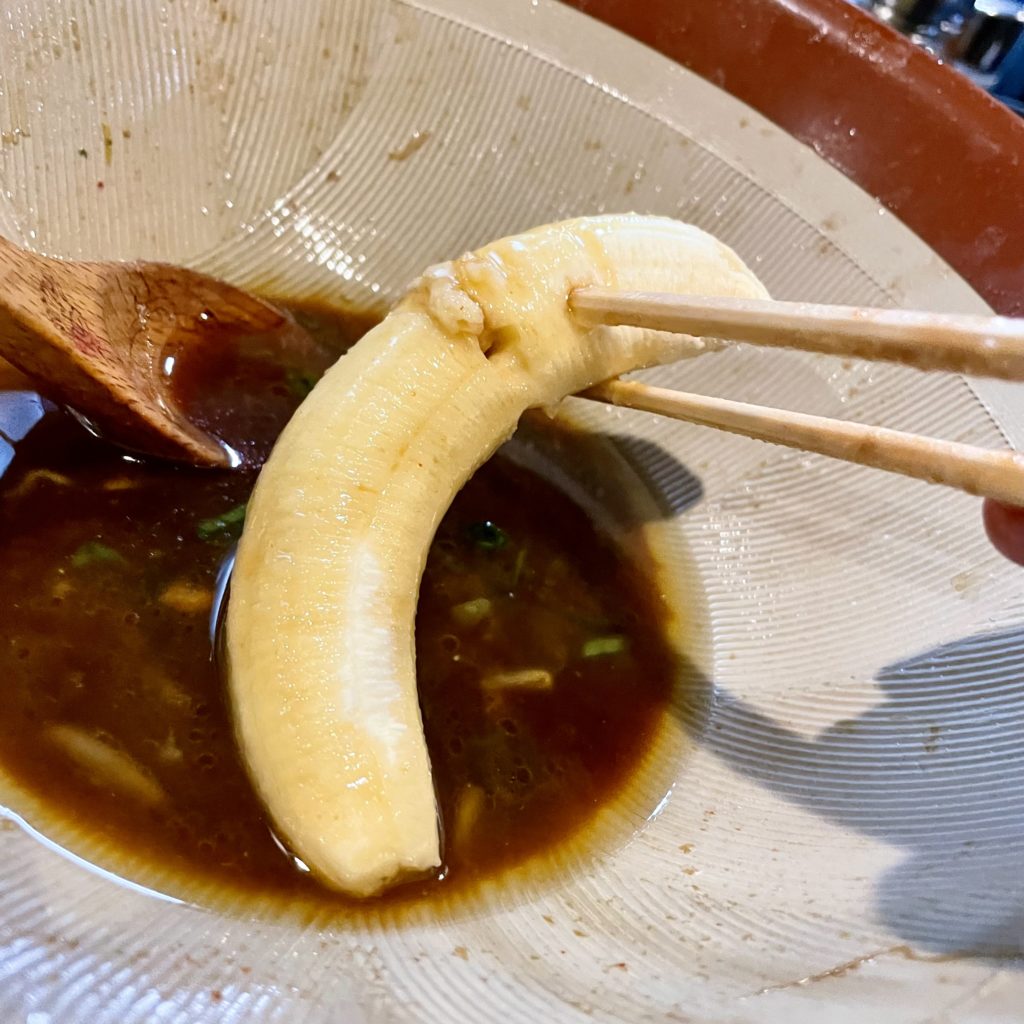 多分うまいやろなと思ってタレに付けてみたオイリーバナナ、ちゃんとおいしかった!