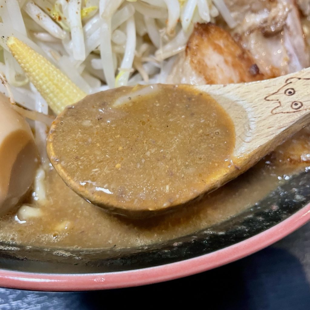 軍団さんの代名詞であるドロドロ濃厚豚骨スープは半端ない存在感!味噌を溶いたスープは独特の風味で旨味レベルがぶち上がってる!!