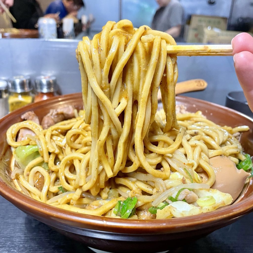 しなやかでムキムキな太麺にスパイシーカレーがバチバチに絡む!辛さはそこまでなく旨味が強いタイプ!