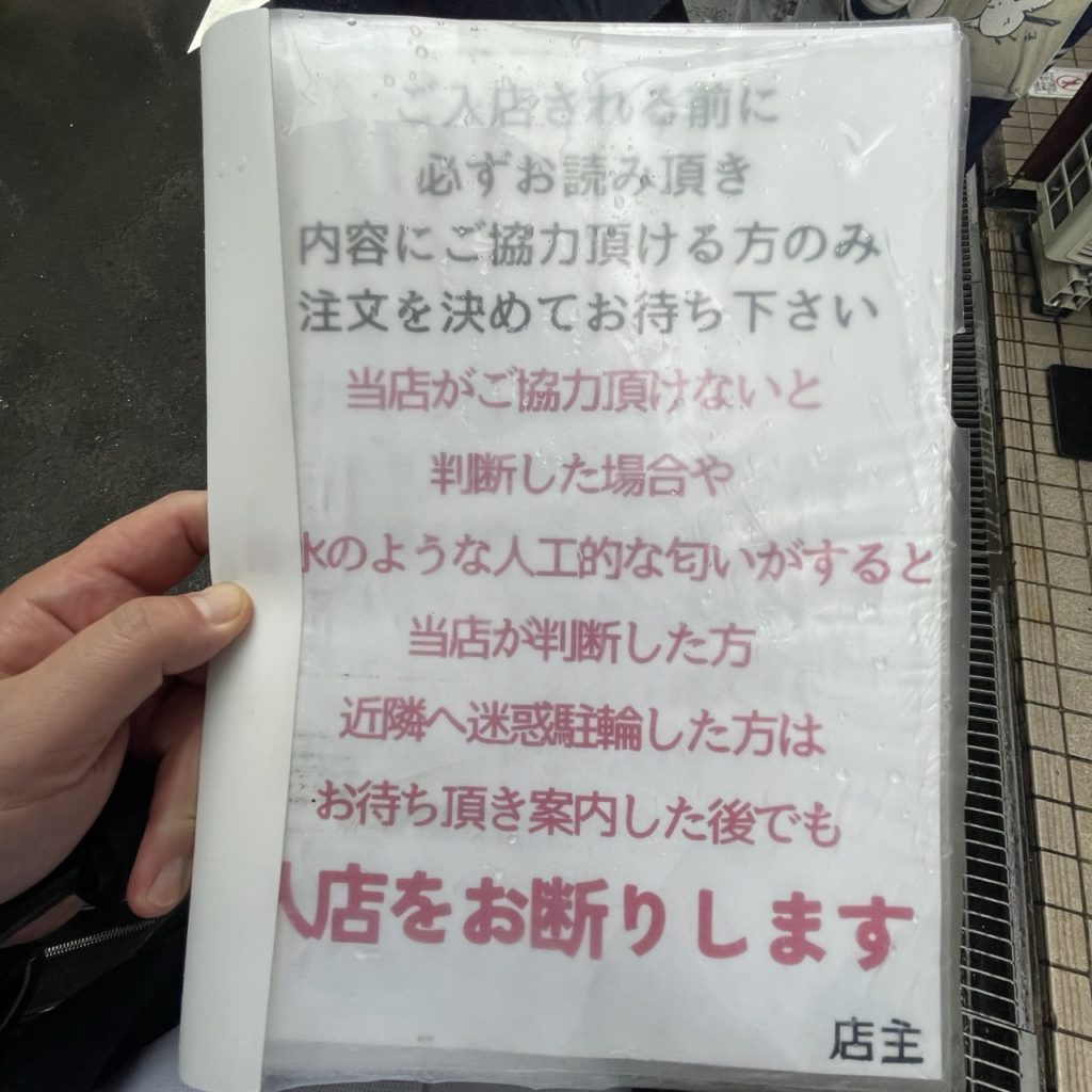 待ってる間、まずは外に置いてあるファイルに目を通します。こちらには駐輪や注文方法、動画撮影や香水の匂い等のルールが記載されており、これらに同意しないと入店できないそうです。