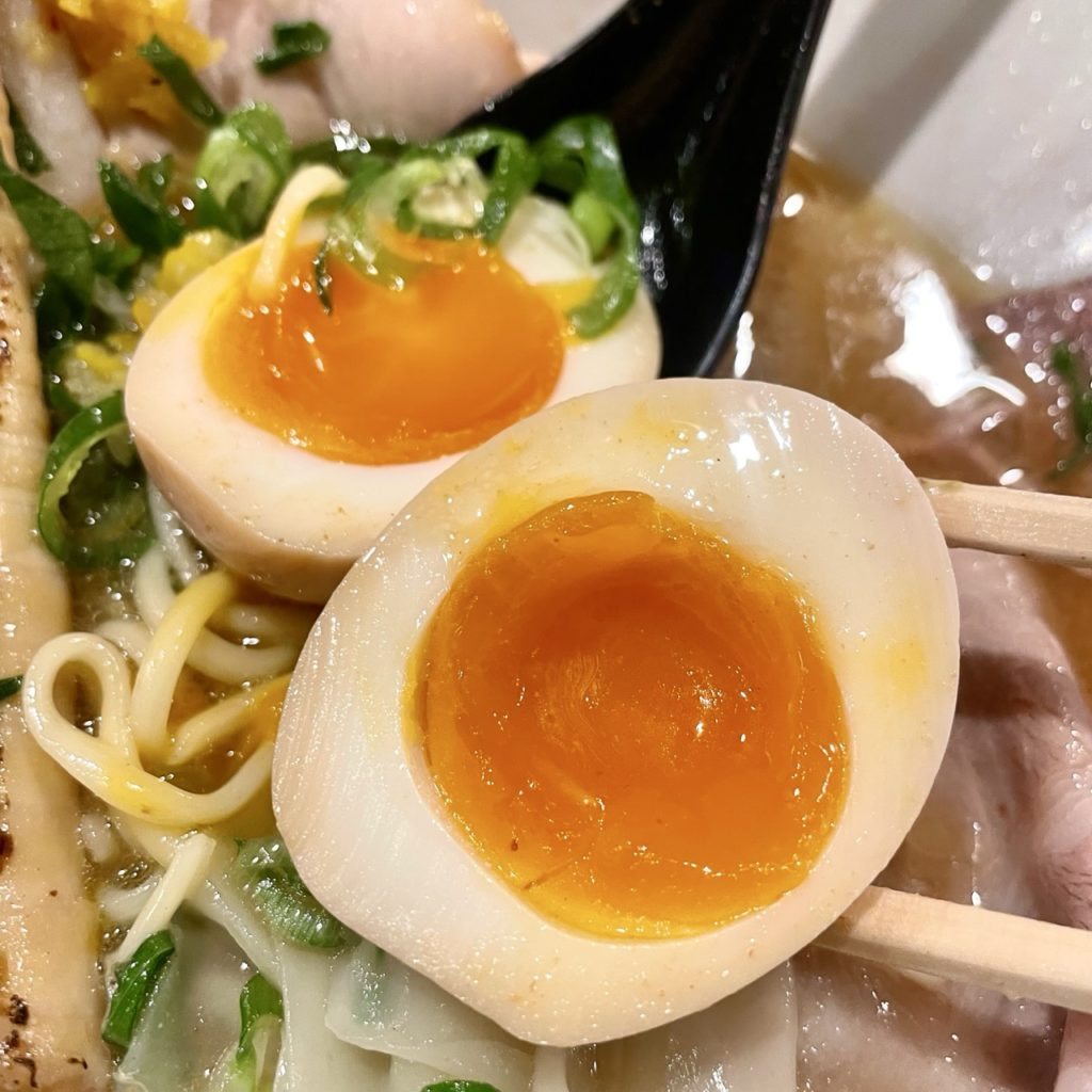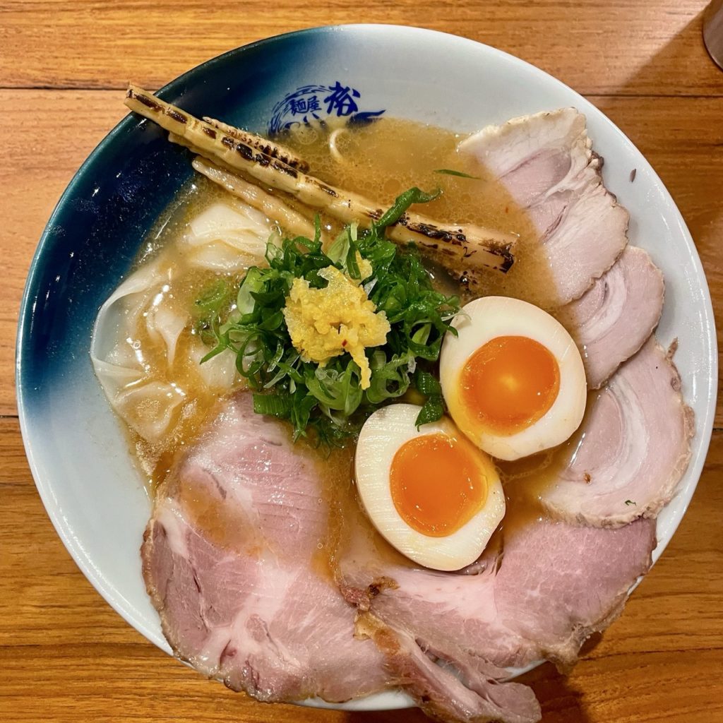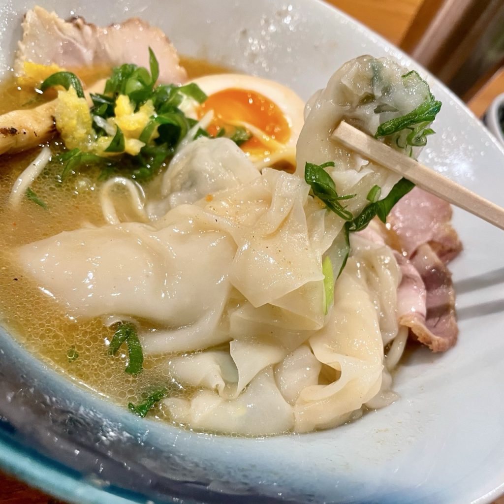 トッピングはチャーシュー・味玉・メンマ・ワンタン・ネギ、そして柚子皮が添えられています。
