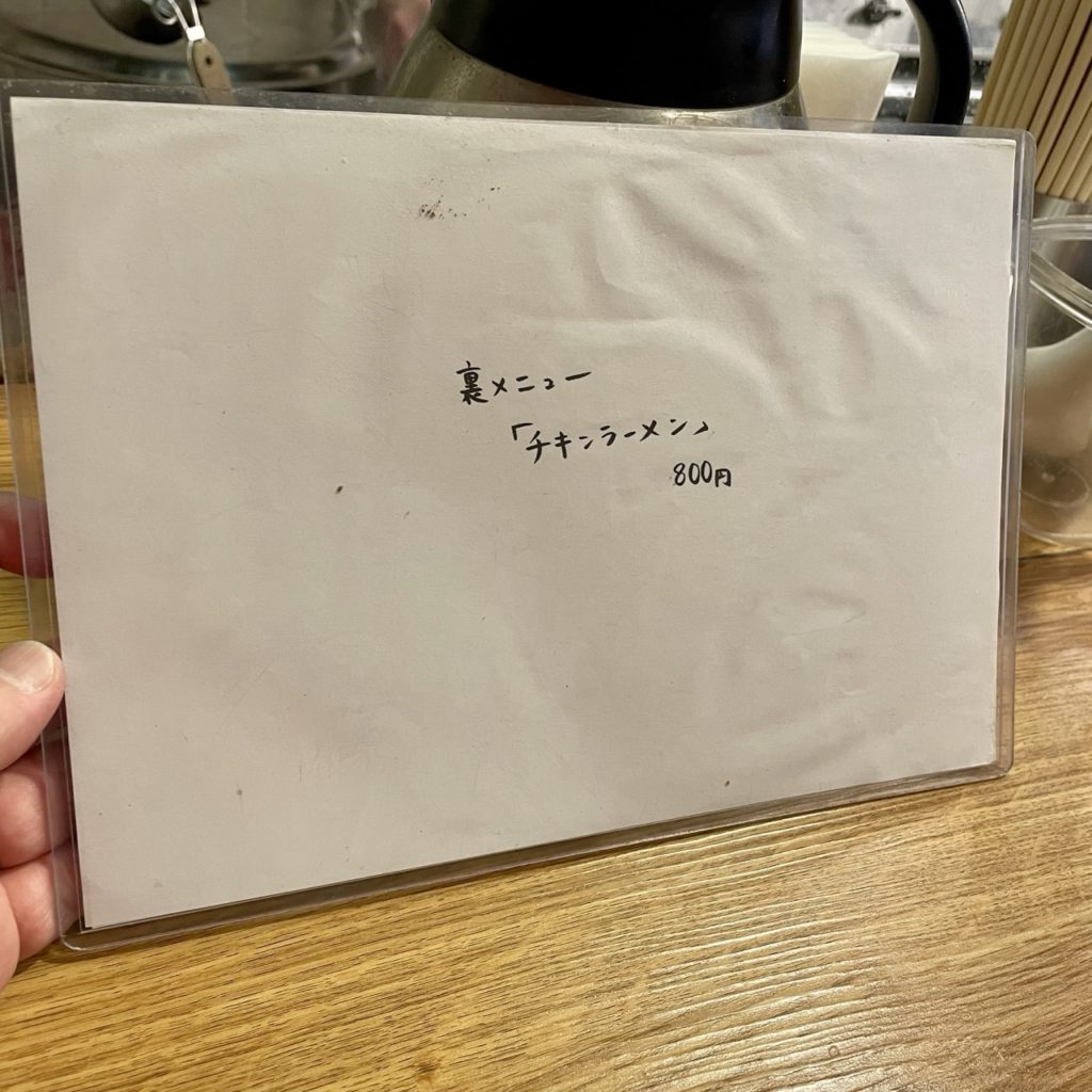 メニューを裏返すと裏メニューのチキンラーメンの文字が!調べてみると生卵が浮いたかけスタイルの中華そばのようです。