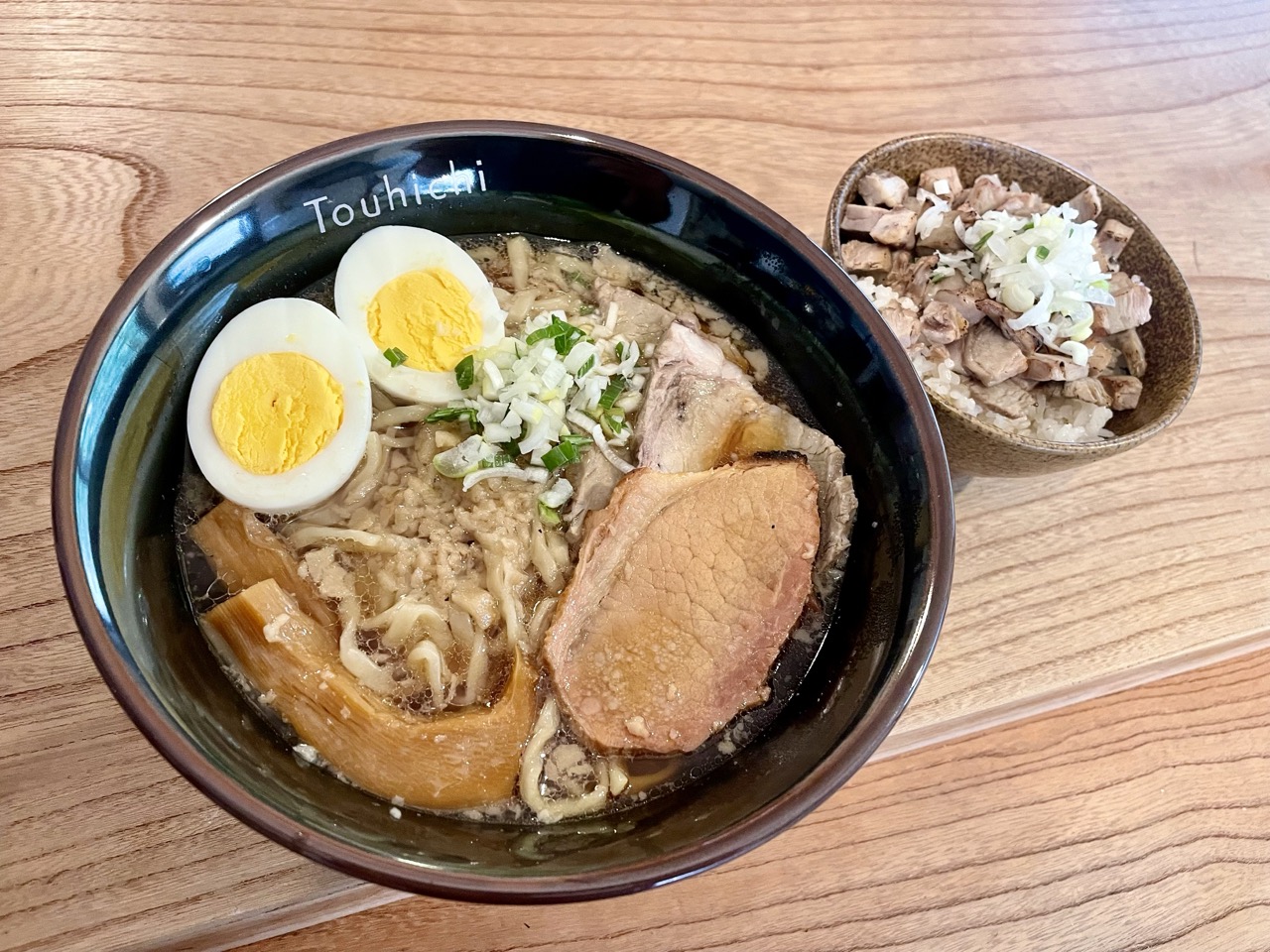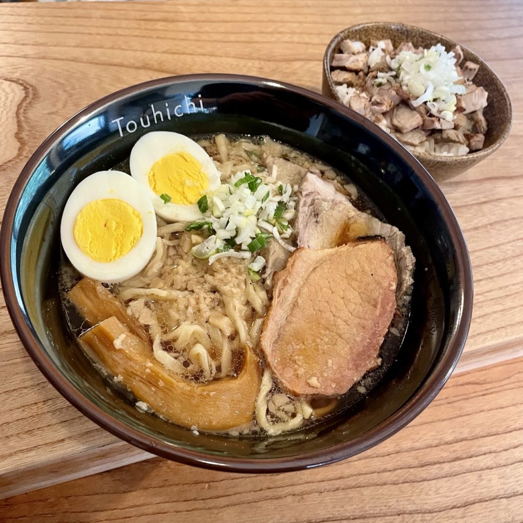 追加トッピングとして蒸し豚・ゆで卵・ネギを加えております。