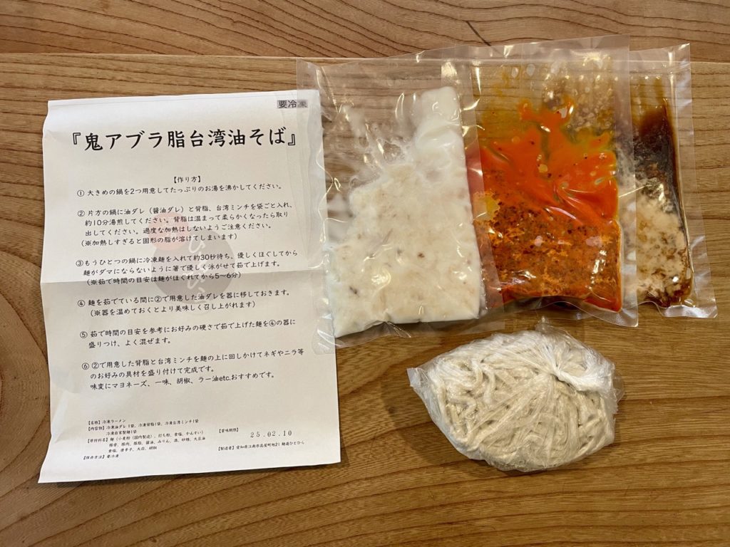 セット内容は冷凍麺・油ダレ・台湾ミンチ・背脂となっています。パウチが3つに分かれているあたり、本気度の高さを感じますね!