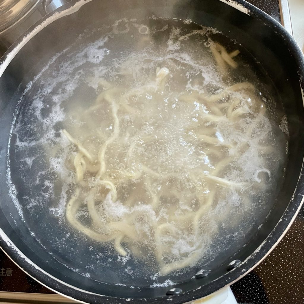 麺がかなりの極太麺なので、前回の反省を活かし大きめの鍋で茹でていきます。