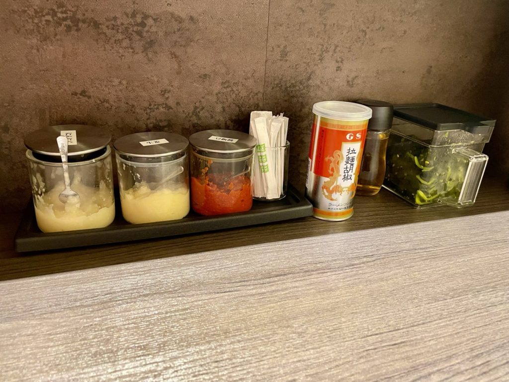 卓上調味料はにんにく・生姜・豆板醤などひと通り備えてありました。カッパ(漬物)が卓上でセルフなのがポイント高いです。