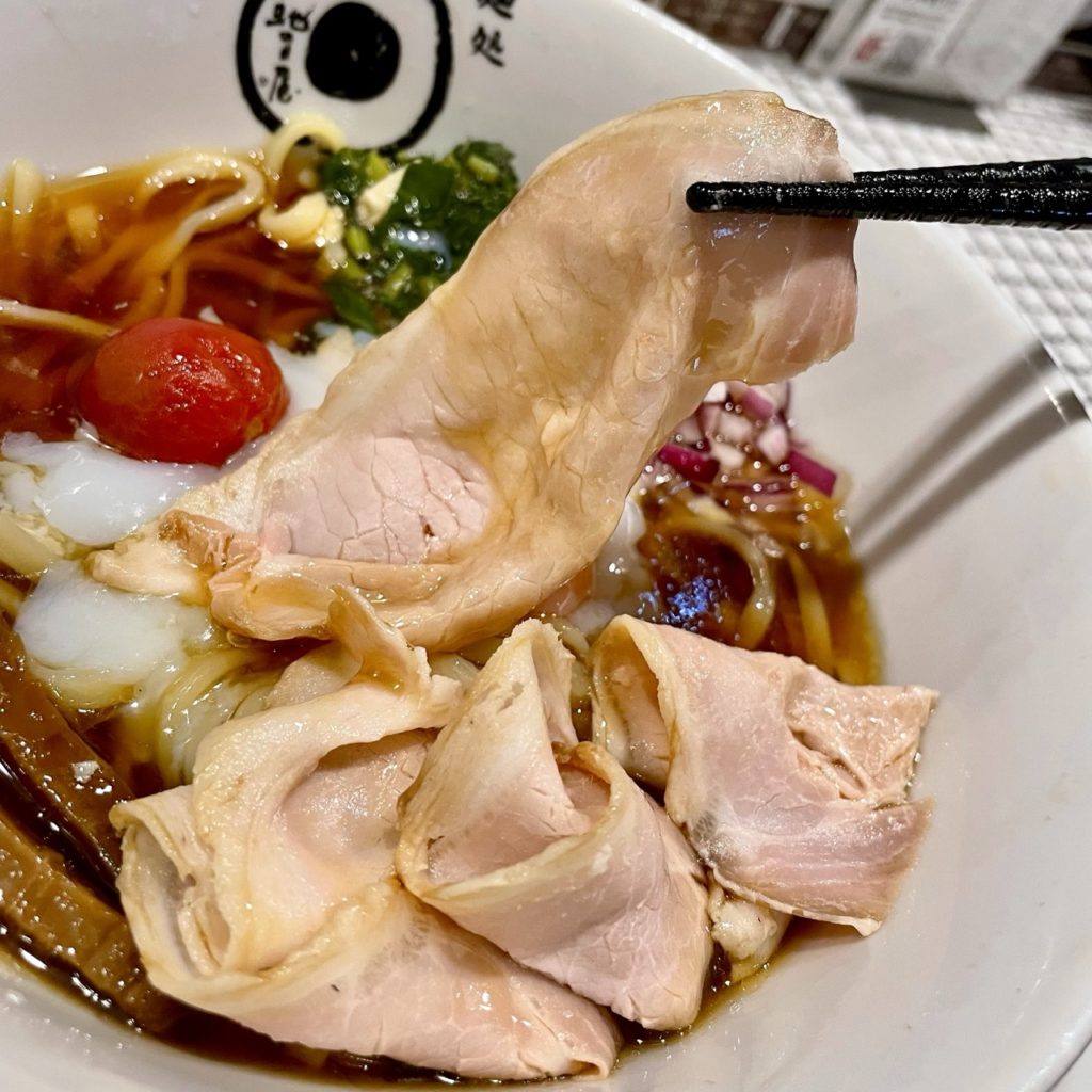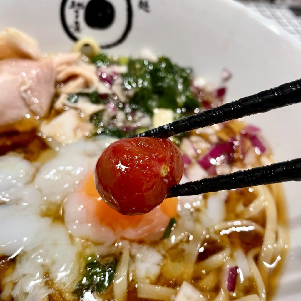 鶏もも焼き・豚チャーシュー・メンマ・温玉・ミニトマト・赤玉ねぎ・モロヘイヤ。