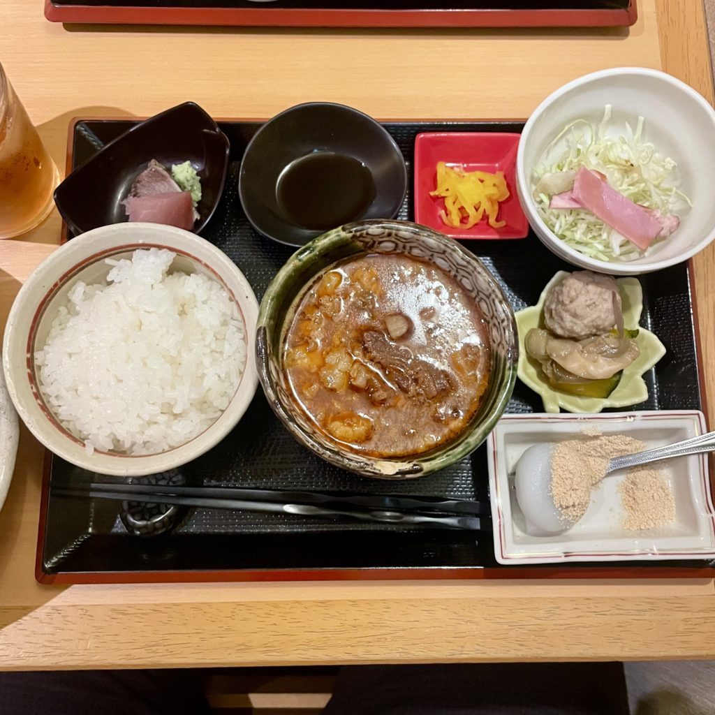 つけ汁は甘辛い味付けで、関西人が好みそうな懐かしさを感じる牛すじスープ。