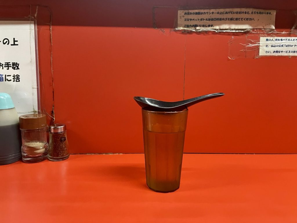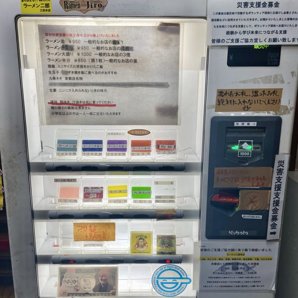 食券提出時に申告で味薄め・脂抜き、汁抜きという汁の少ないラーメンに変更することができます。2024年8月現在、こちらの券売機は小銭が使えないそうで、トッピング類は全て現金対応となっています。(現在は新券売機が導入されています)