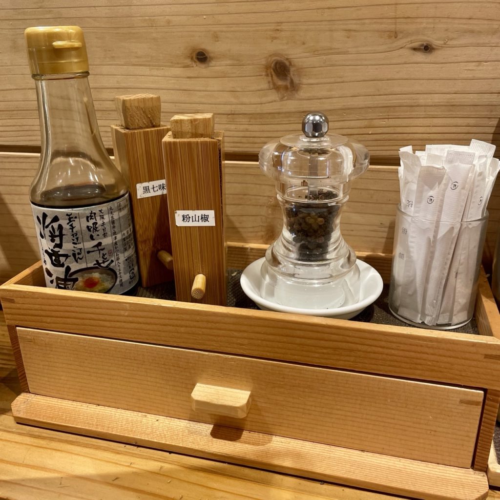 卓上には醤油・黒七味・粉山椒・黒胡椒。