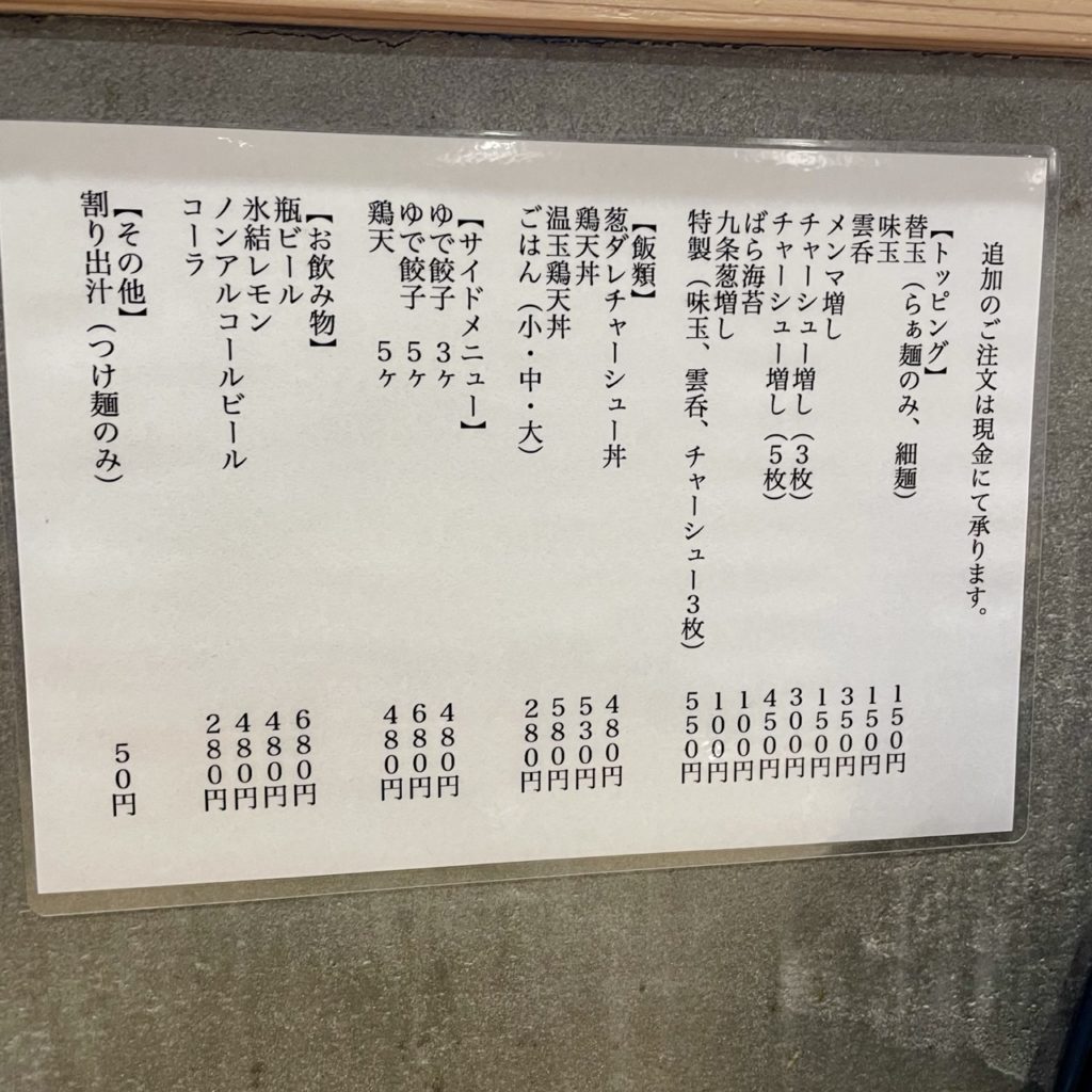 席に貼ってある上記メニューは、現金払いで追加可能となっています。