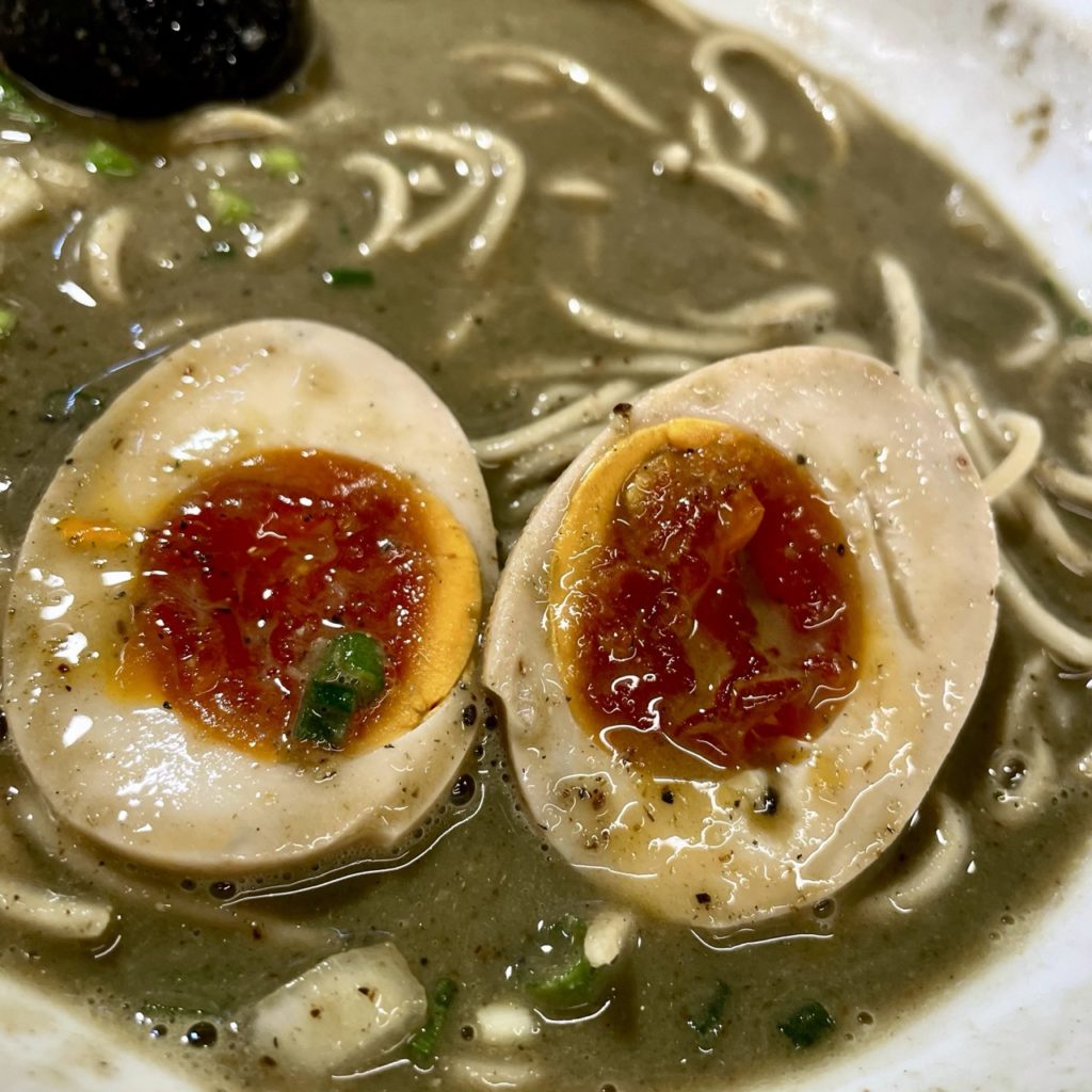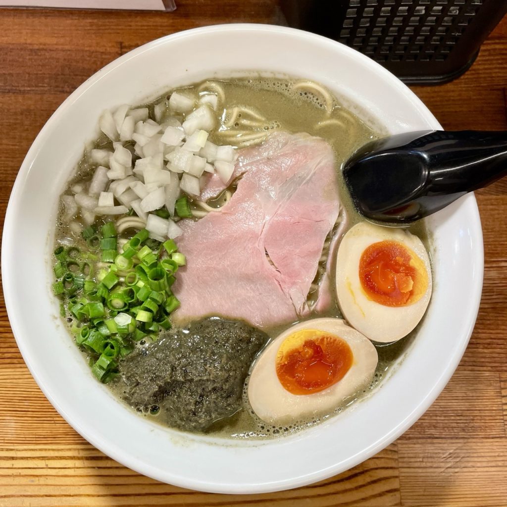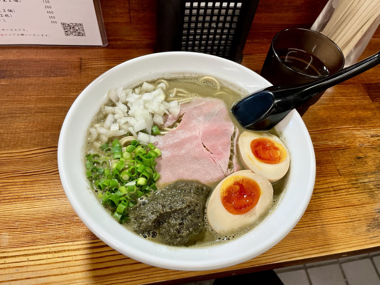 具材はチャーシュー・玉ねぎ・ネギと、増した煮玉子になります。