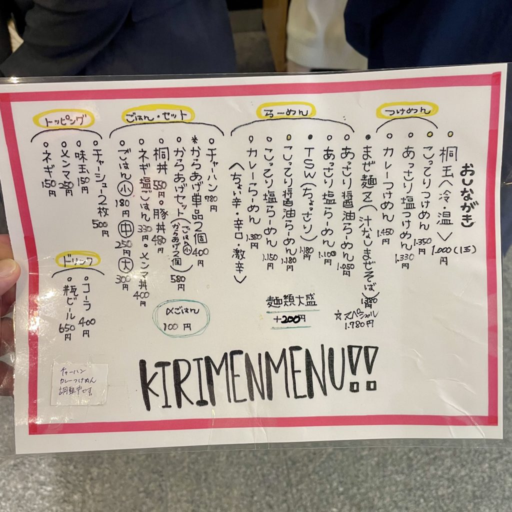 メニューは代名詞の桐玉をはじめ、ラーメンからまぜ麺まで幅広くラインナップ。