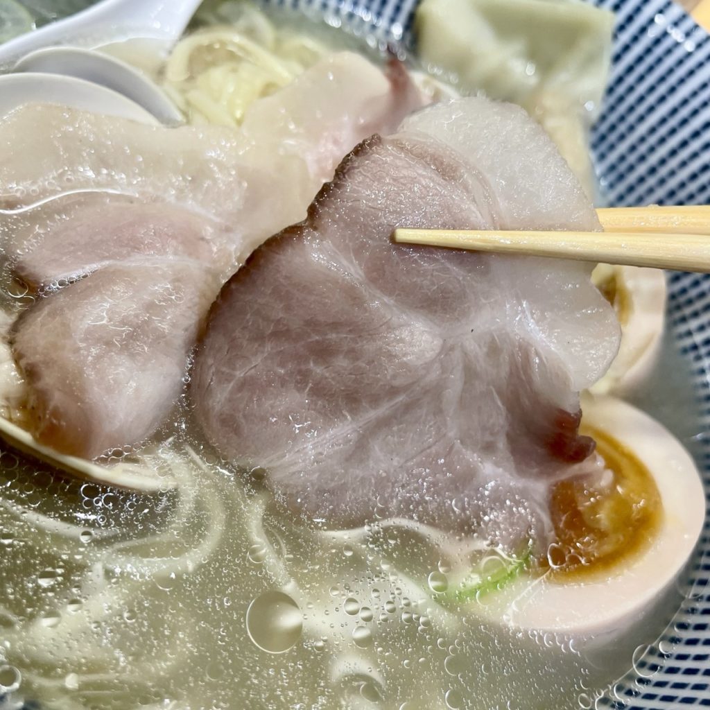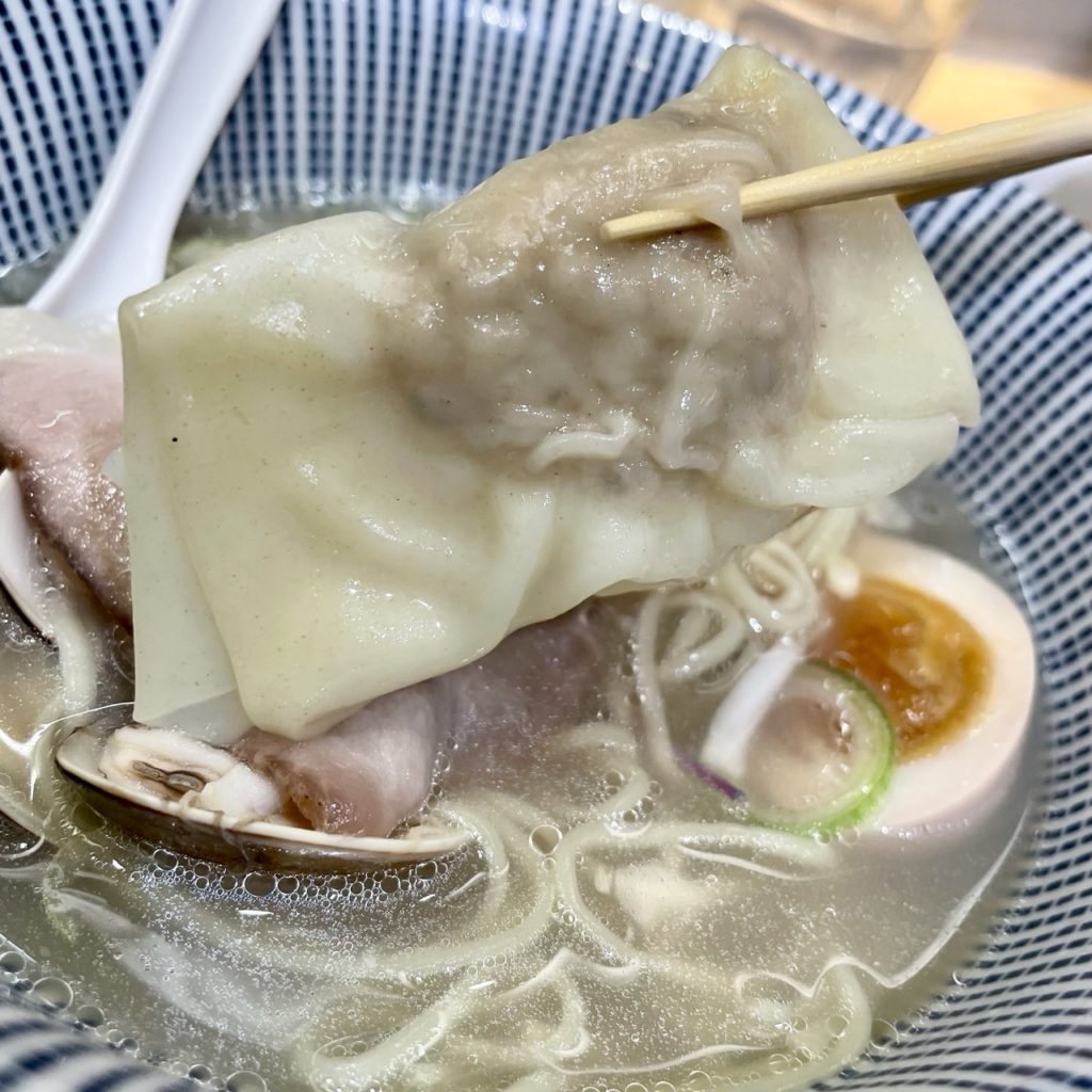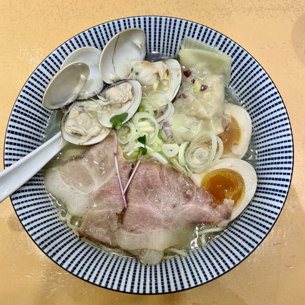 具材はチャーシュー・はまぐり・ワンタン・味玉・ネギ・かいわれ。
