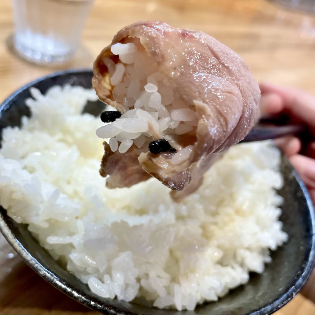 チャーシューは分厚い方がそりゃいいですが、肉巻きライスは薄切り肉の方が巻きやすいし、米とよく馴染む気がします。