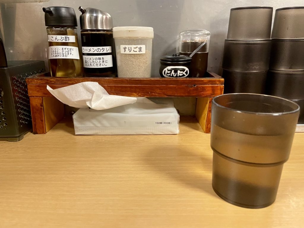 卓上にはこんぶ酢・ラーメンのタレ・すりごま・にんにくの味変調味料が並んでいます。