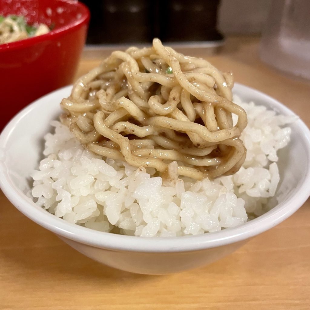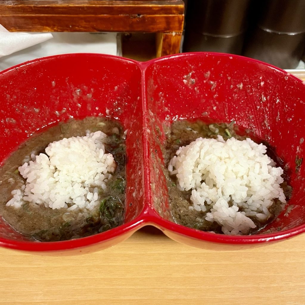 さて〆は悩んだんですが、替玉まで辿り着けなさそうだったので残ったごはんをドボン。