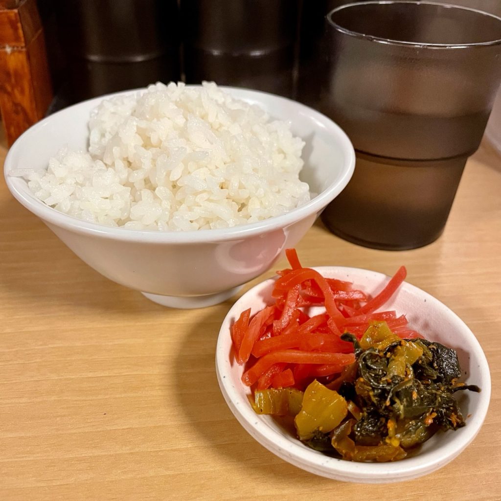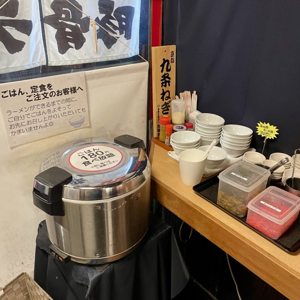入り口付近にセルフコーナーがあり、180円で食べ放題のご飯に、激辛高菜・紅生姜、マヨネーズなどの調味料類があります。