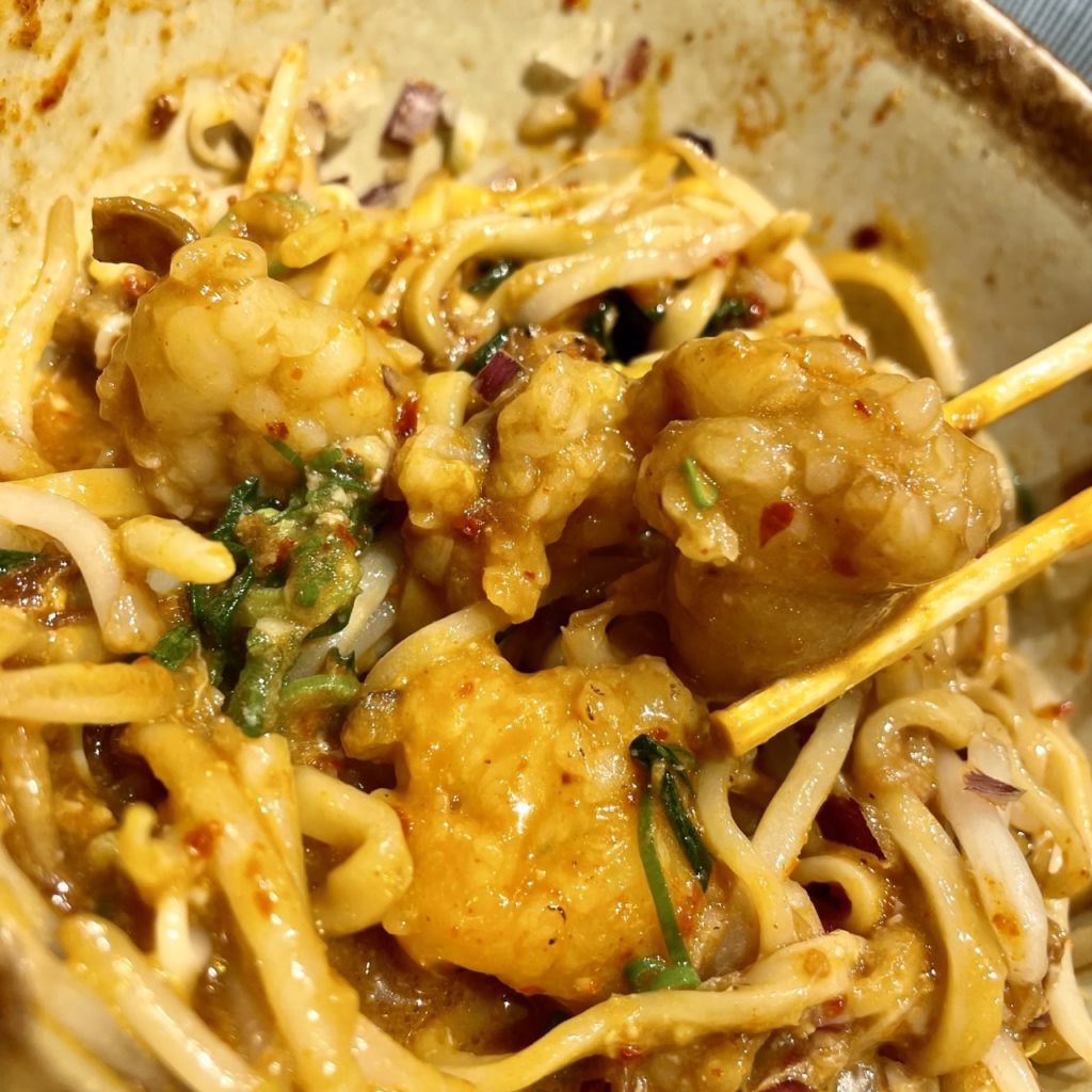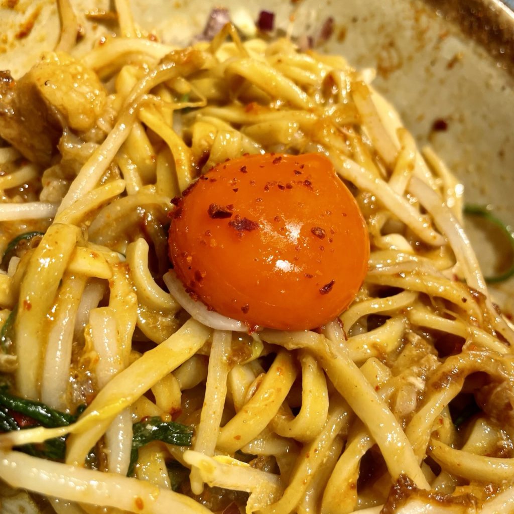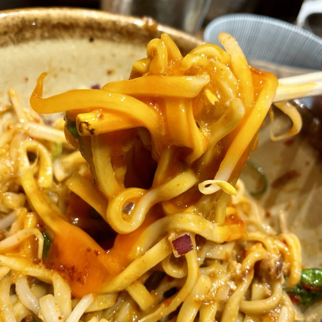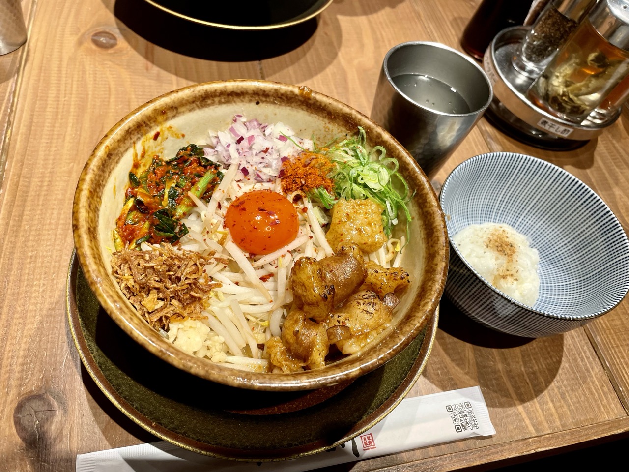 一味のピリ辛と甘い醤油ダレが合わさった、スタミナ系の甘辛まぜそば!