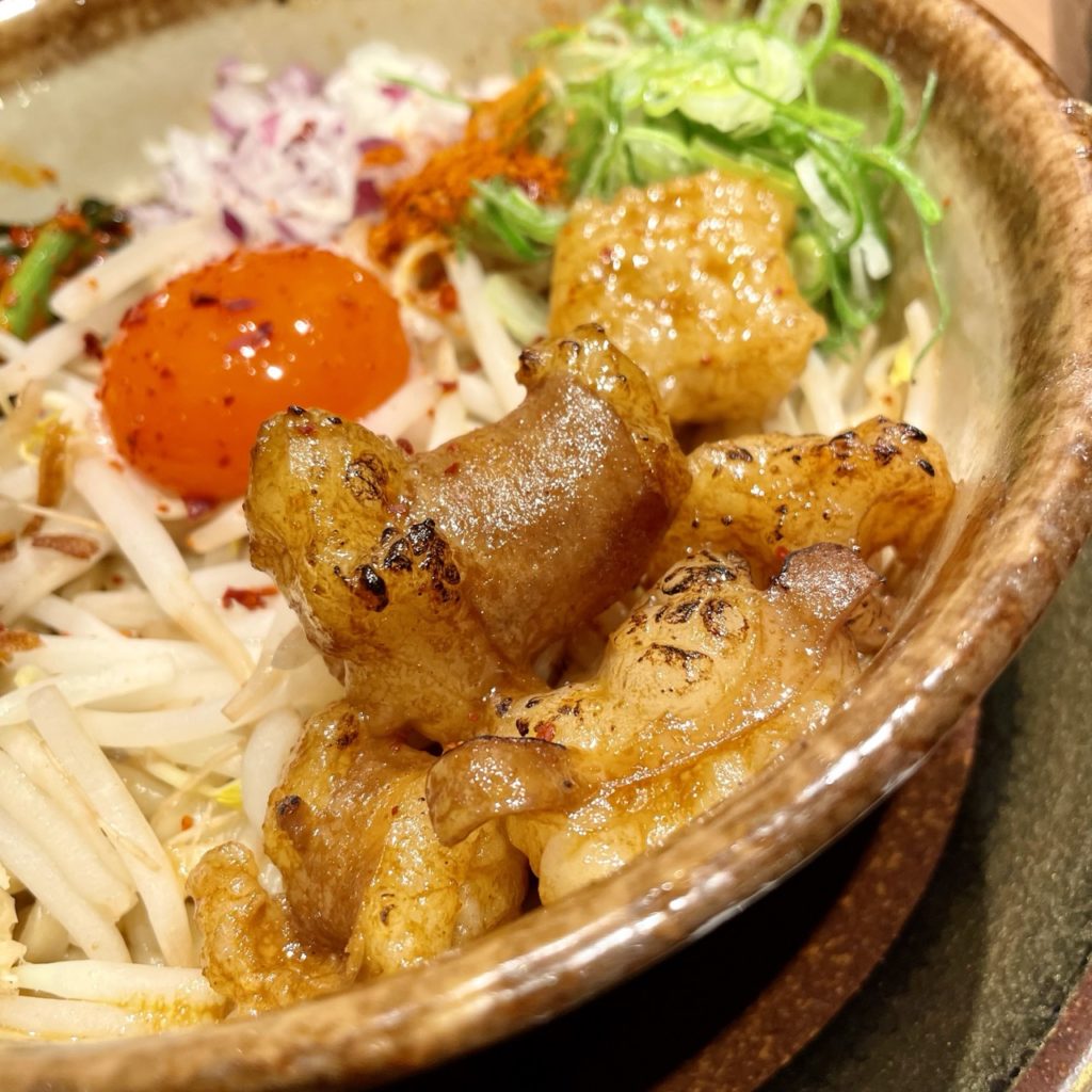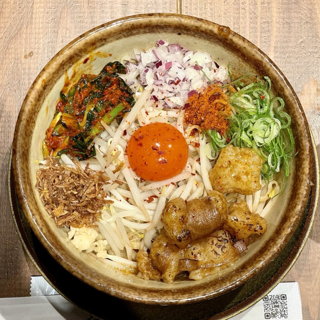 具材はホルモン・卵黄・もやし・ニンニク・ネギ・玉ねぎ・ニラキムチ・出汁ふりかけと多彩なラインナップ。