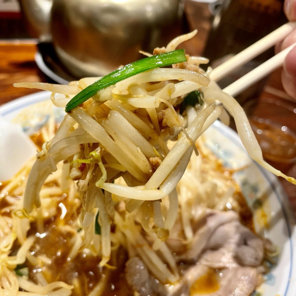 具材はチャーシュー・もやし・ニラ・ミンチ・糸唐辛子、要するに炒め野菜が上にドンと載っているみたいですね。