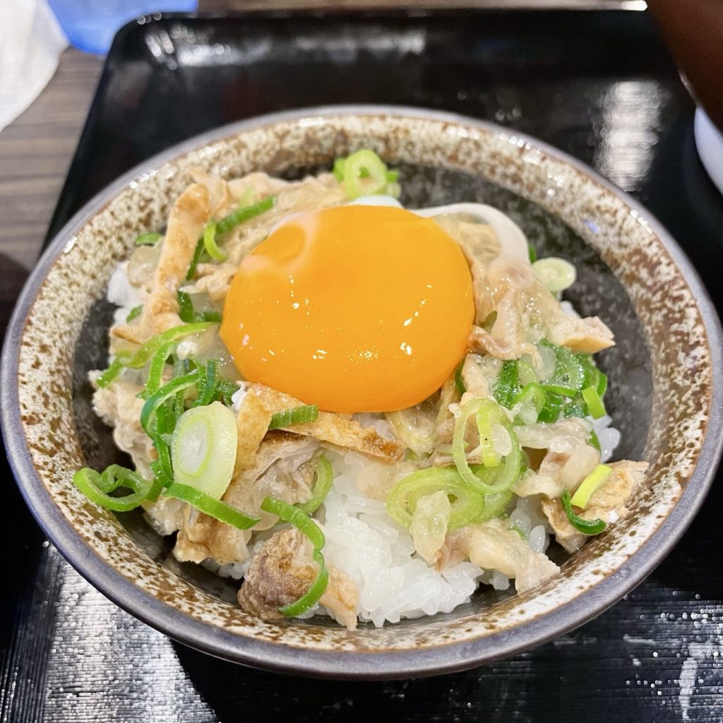 具材は油かす・大判きつね・ねぎ、そしてサービスしてくれた生卵。
