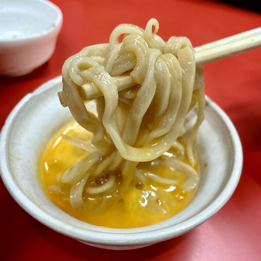 生たまごは本来でしたら麺に直接落として釜玉風アレンジが好きなんですが、スープめっちゃ美味かったので「これにマイルドさは要らんな」と判断し、すき焼き風に方針転換。